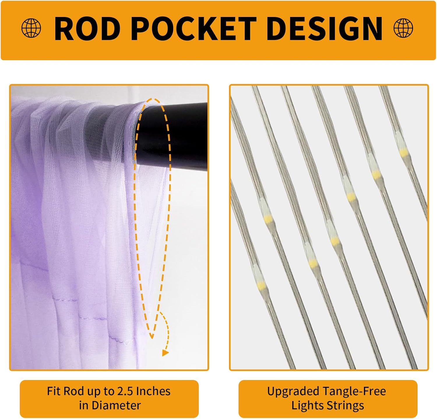 - Elegant Combination of Tulle Backdrop Curtains and Lights - Package Includes: 2 panels lavender sheer tulle backdrop curtains (5ft x8ft each, total 10x8ft).1 set of a 10x8.2ft warm white USB-powered tangle-free string lights (10 strands with 250 LEDs). 12 Transparent clips for hassle-free Installation. (Pro Tip: Buy multiple sets for fuller coverage and reduced sheerness!)