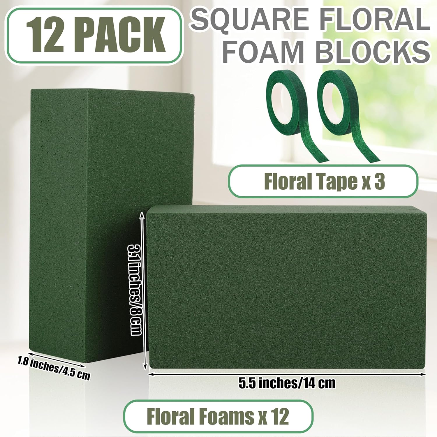 - Complete Floral Arrangement Kit: our floral foam blocks set includes 12 floral foams square, and 3 rolls of green floral tape for all your flower arranging needs. Ideal for both fresh and artificial flowers, this kit supports a variety of creative floral projects; with this set, you'll have all the essential tools to start your floral projects right away