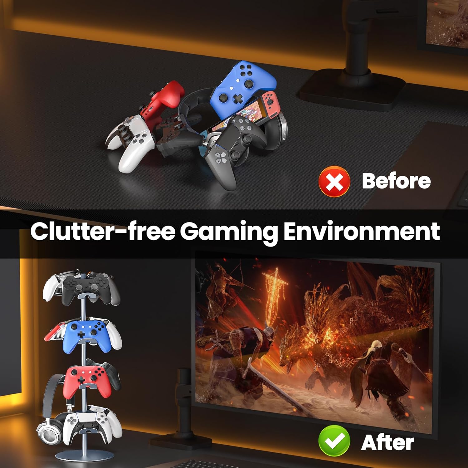 - Stable Design: The headset and controller stand comes with the sturdy metal hangers and base equipped with anti-slip silicone pad, providing excellent stability and ensuring that the gaming controller stand does not easily wobble or fall over during use