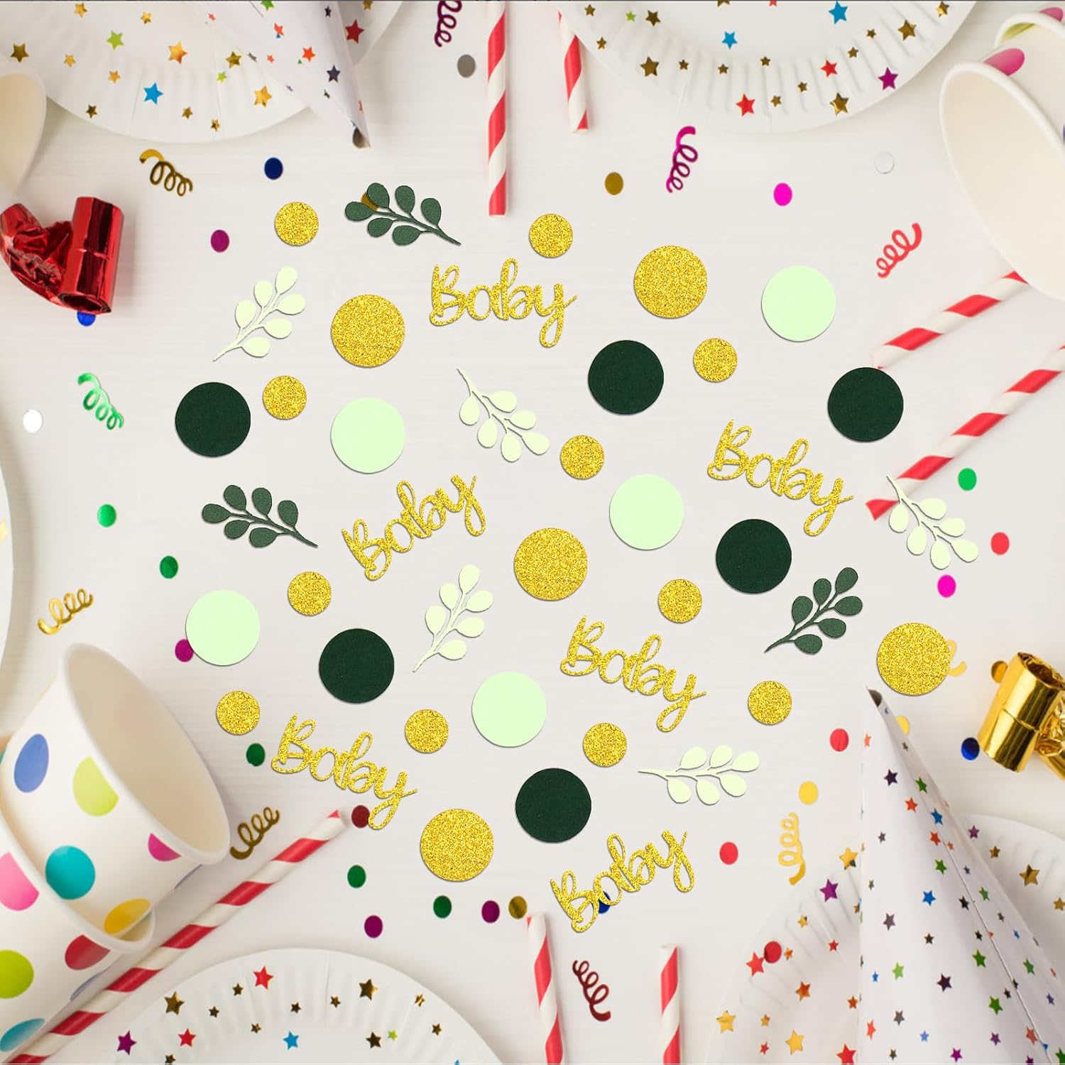 - 1.The greenery baby shower confetti package include:300pcs total,there are 3designs round circles sage leaves and “baby” letters in 3 colors(glitter gold/light green/dark green/),looks fresh and full of vigor.