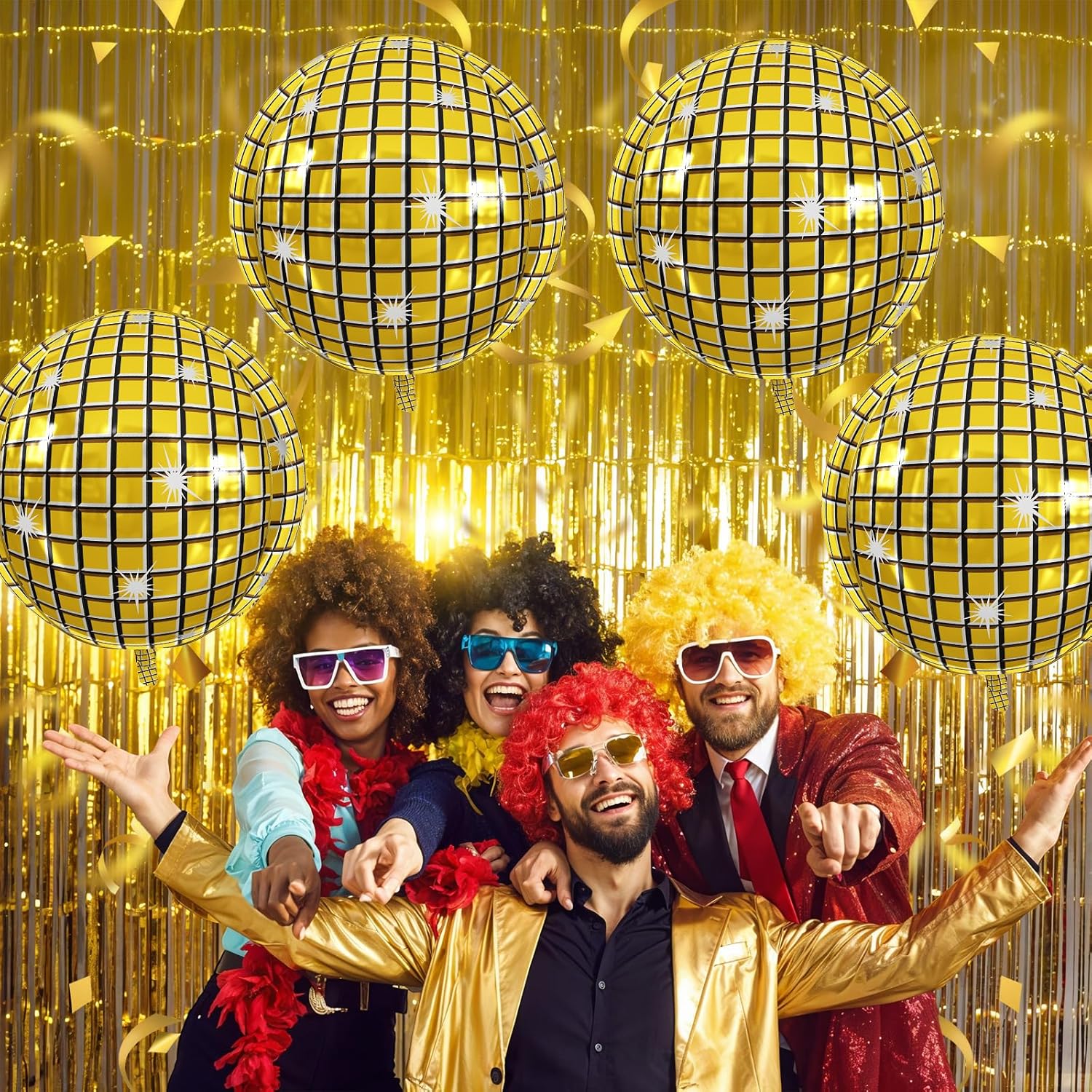 Disco Ball Balloons 4PC,Foil Disco Balloons 22 Inch 4D Round Metallic Gold Balloon for 70s 80s Birthday Bachelorette Graduation Gold Decorations
