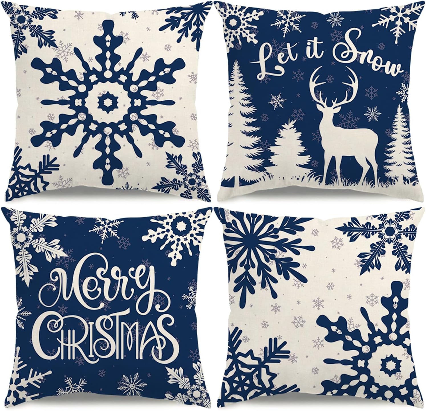 Christmas Pillow Covers 18x18 Blue Christmas Decorations Snowflake Reindeer Throw Pillow Covers Xmas Tree Winter Holiday Decor Cushion Case for Sofa Couch Set of 4