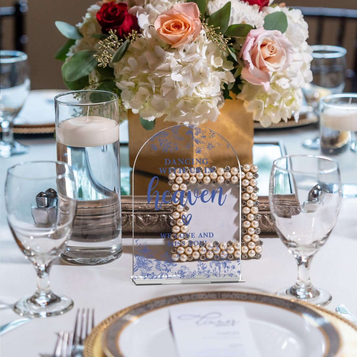 Acrylic Wedding Signs, Dusty Blue Wedding Decor, Blue Weddings Decor, Modern Calligraphy Arch Acrylic Table Top Sign for Weddings Parties Dinners - Dancing With Us in Heaven (Clear)