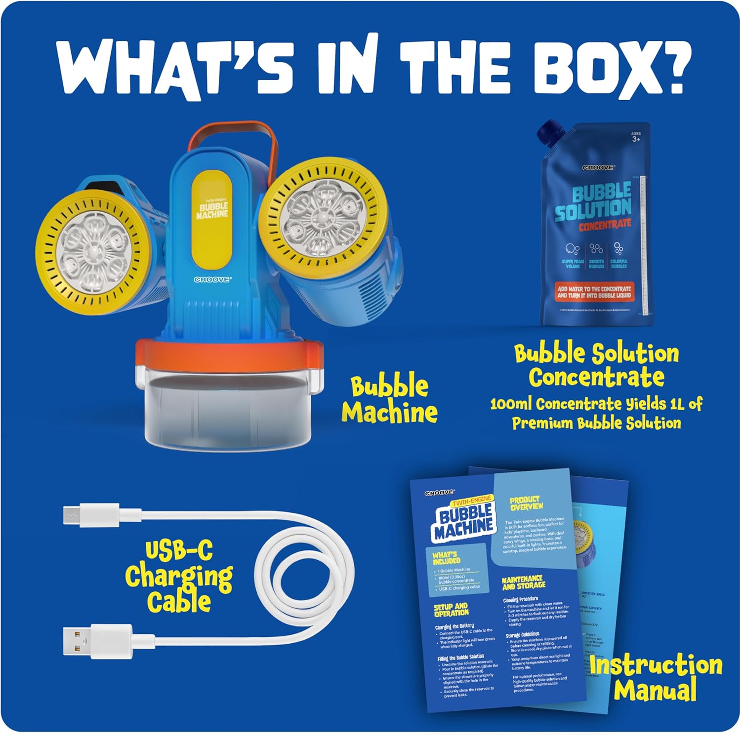 - WHAT’S INCLUDED: A bubble machine, 100ml bubble concentrate (Yields 1L), an easy-to-follow user manual—all packed in a beautifully designed, kid-friendly set suitable for ages 3 and up.
