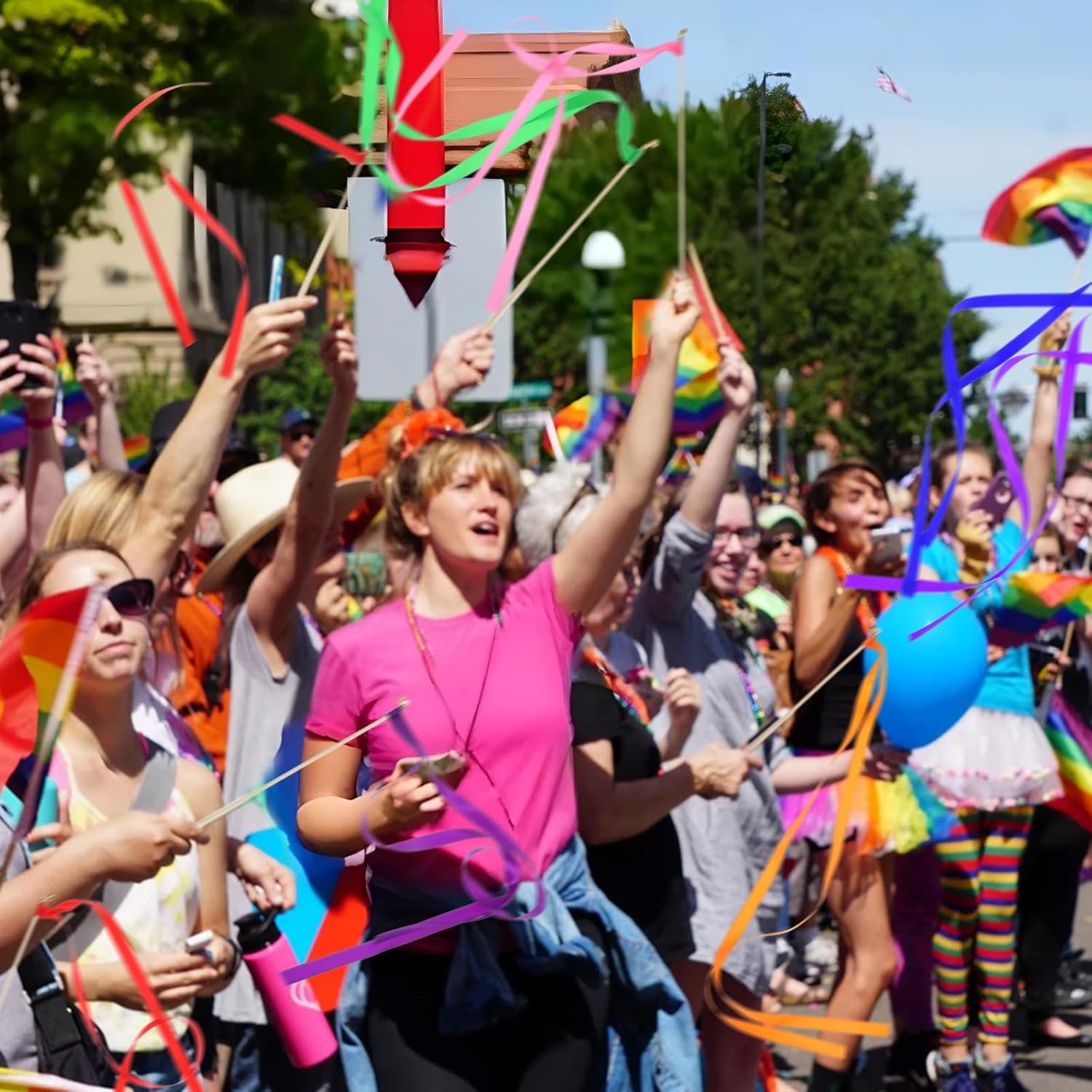 100Pcs Multi-Color Ribbon with Gold Bell, Fairy Wands Chromatic Silk Wish Wand Streamers Sticks for Wedding Send Off, Bridal Shower Party Photo Props, Birthday, Pride Parade Decorations