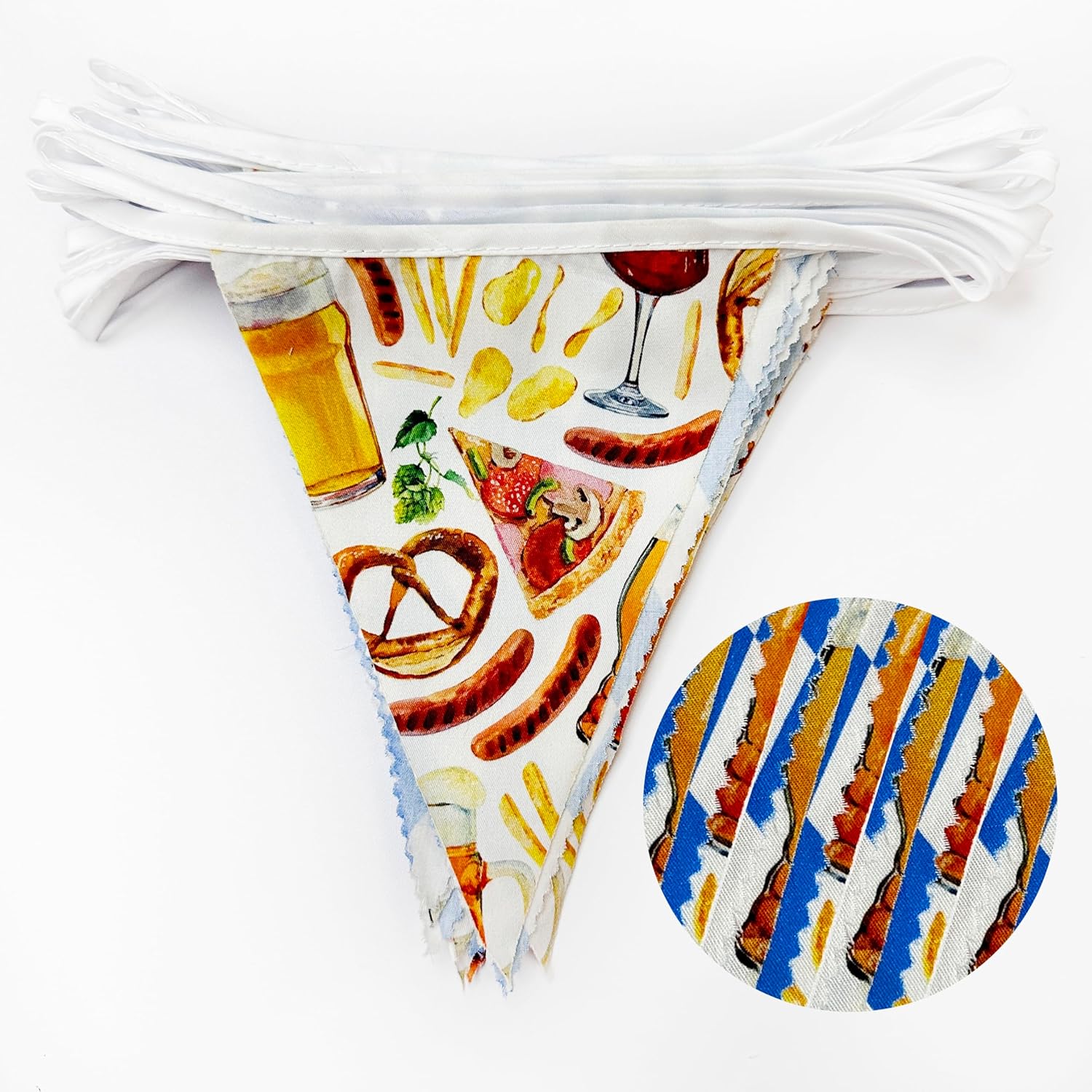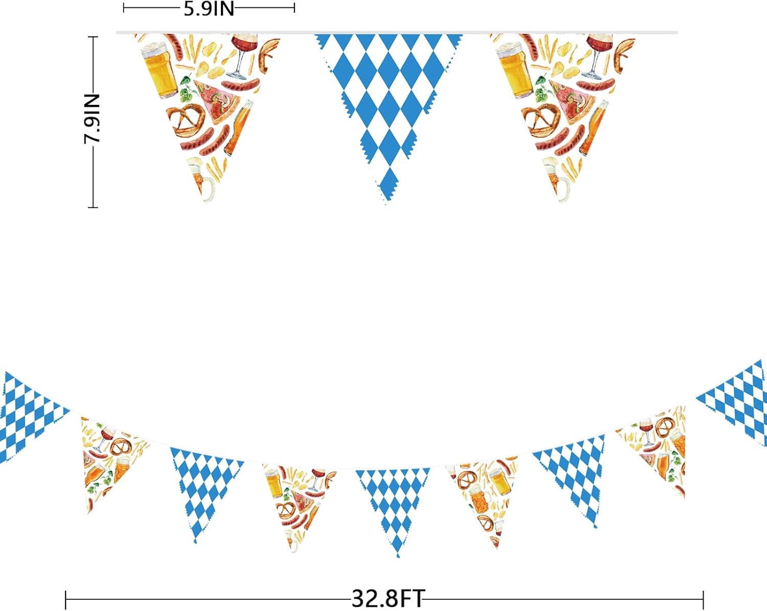 - Package Including:1 pack oktoberfest bavarian theme fabric bunting banner garland in blue white checkered and German beer festival elements printed colors, with 36pcs flags in 10M/32.8Feet. Flag Size: 5.5in width x 7in height.