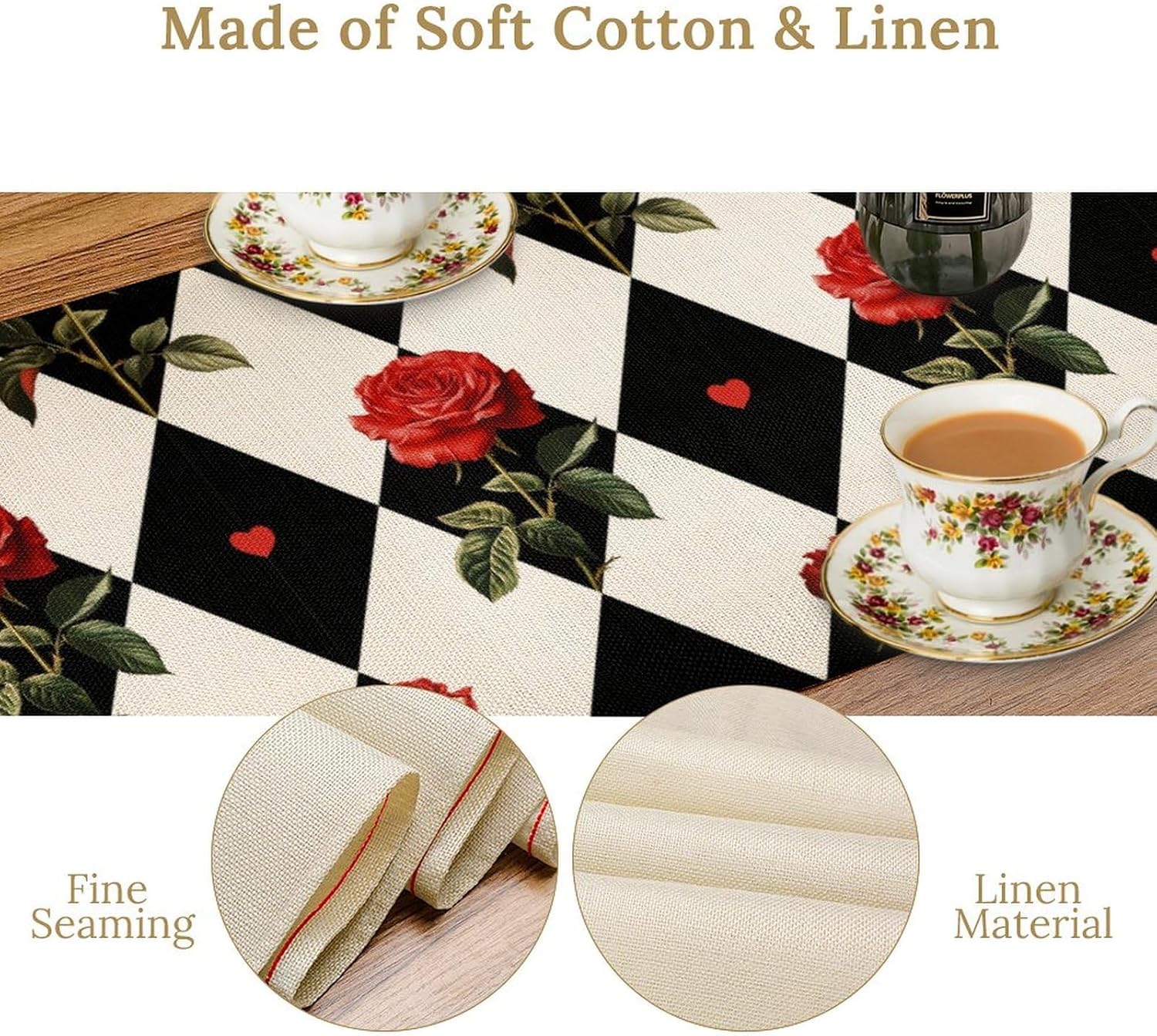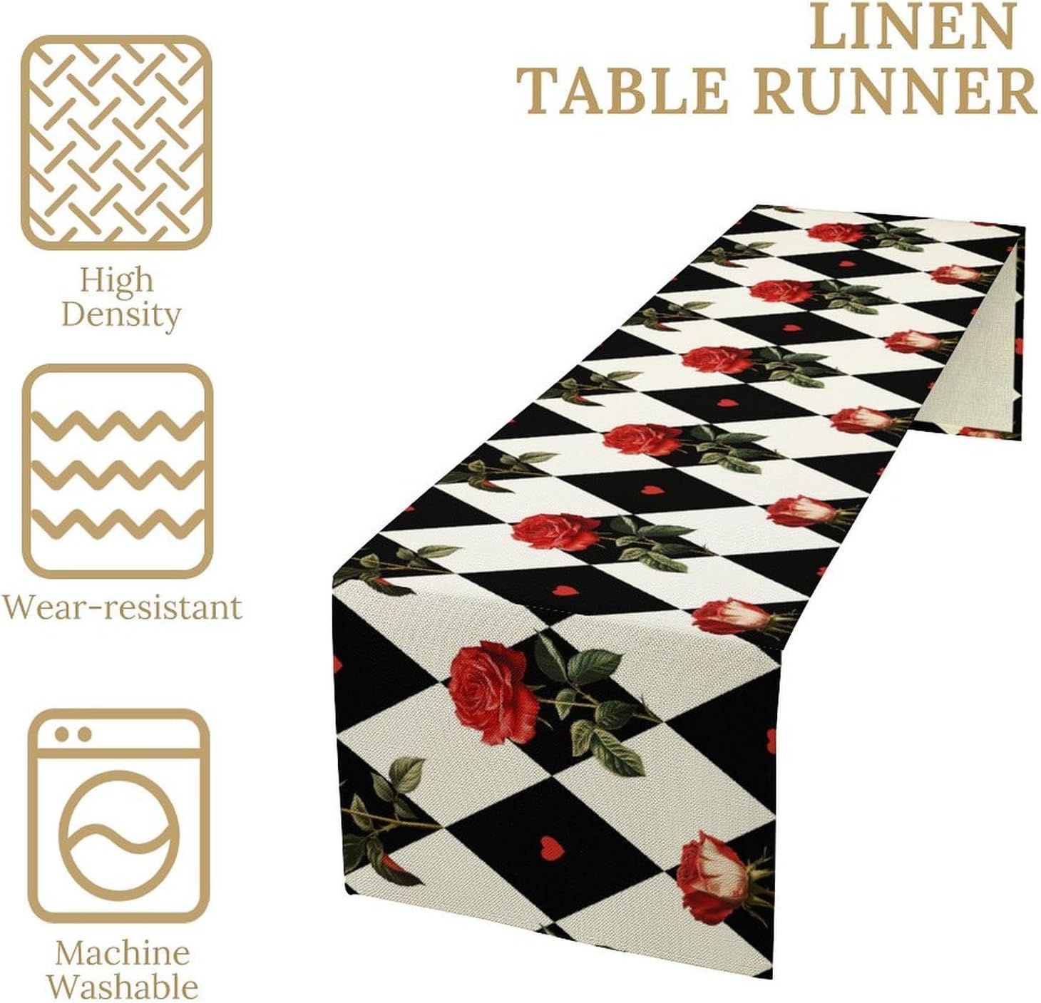 Vintage Rose Table Runner, Red Rose Hearts Black White Checkered Background Table Runner for Kitchen Dinning Table Runner Decor Home Wedding Party Holiday, 13x120 Inch