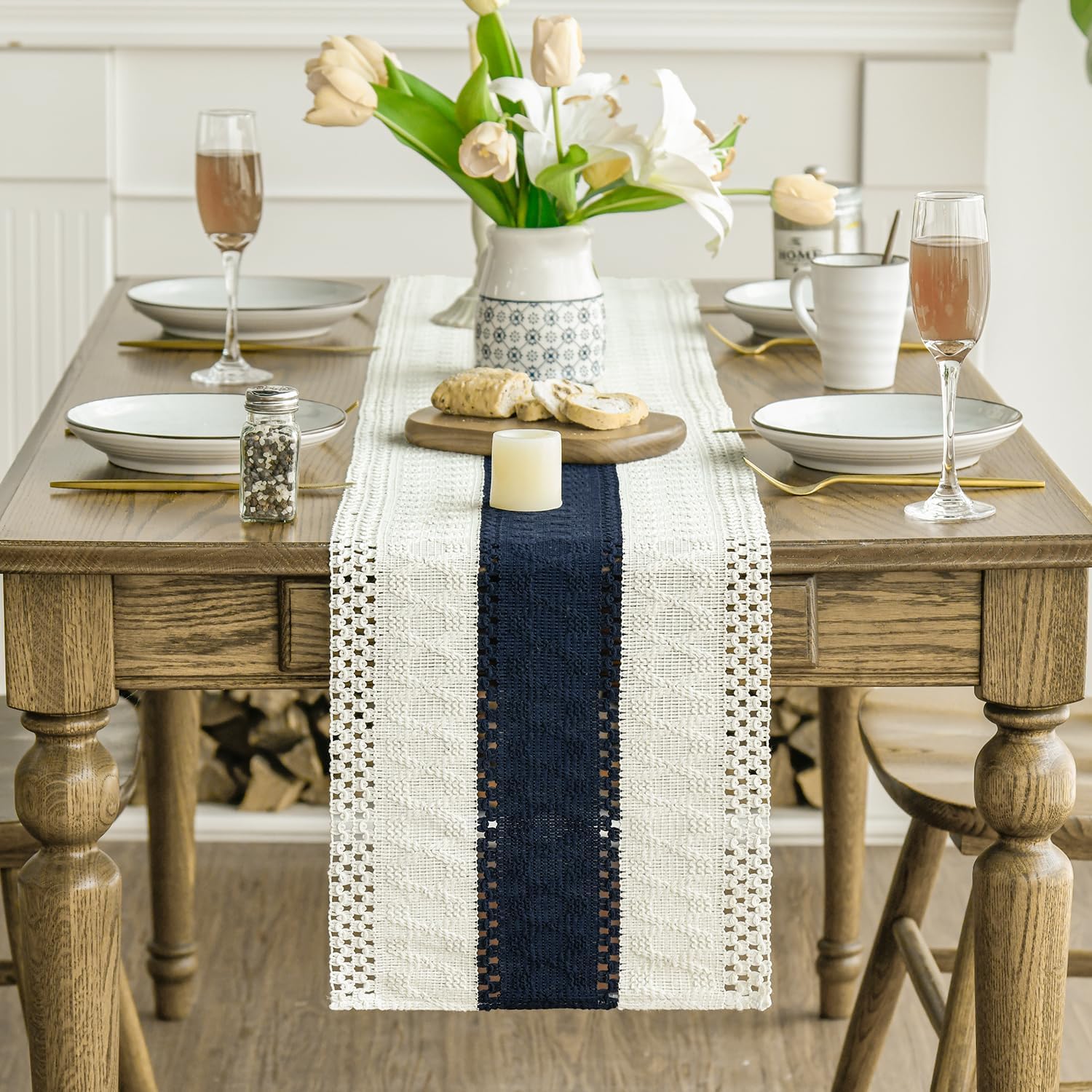 Artoid Mode Dark Blue Farmhouse Rustic Table Runner, Seasonal Holiday Hollow Kitchen Dining Table Decoration for Home Party Decor 12x48 Inch