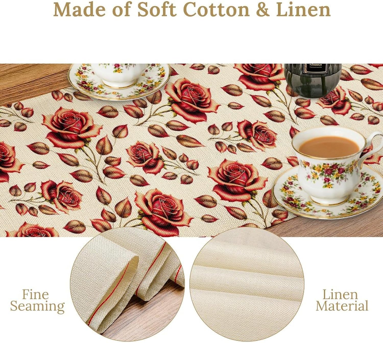 Retro Rose Table Runner, Romantic Love Elegant Plant Red Golden Flower Print Table Runner for Kitchen Dinning Table Runner Decor Home Wedding Party Holiday, 13x90 Inch