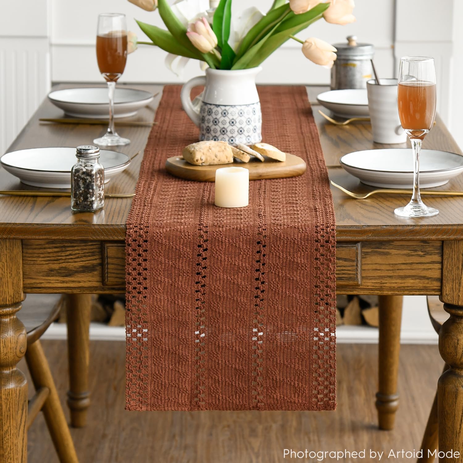 Artoid Mode Caramel Farmhouse Woven Rustic Hollow Table Runner, Seasonal Holiday Hollow Kitchen Dining Table Decoration for Home Party Decor 12x72 Inch