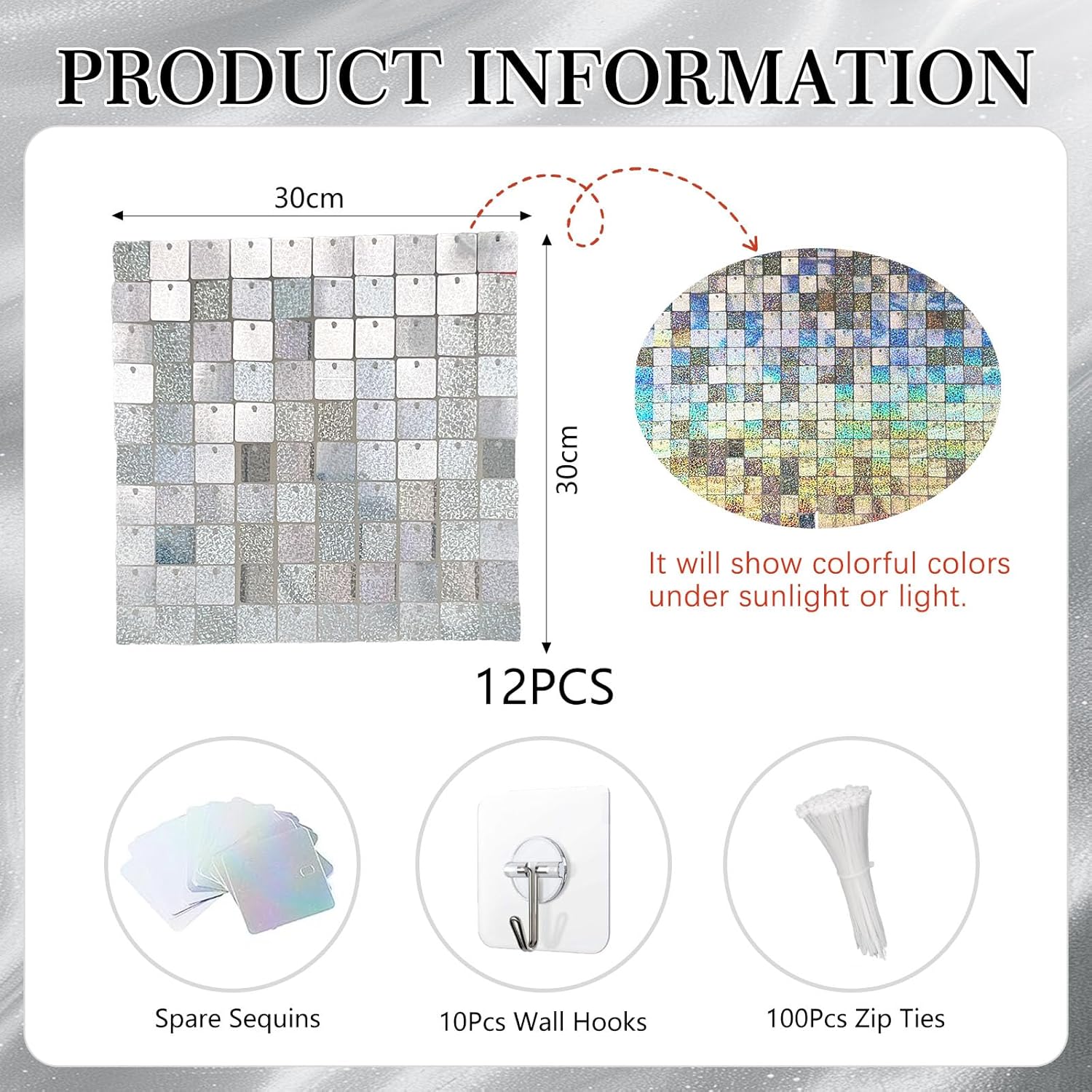 - 【Package Includes】Each box includes 24 silver laser sequin wall panels (12"x 12" each). We provide enough zip ties (100 pcs), a pack of spare sequins, and wall hooks (10 pcs) to support the weight of the wind panel, as well as an installation manual. 24pcs can cover 4x6ft place. More boxs will cover a larger area and have a fuller look.