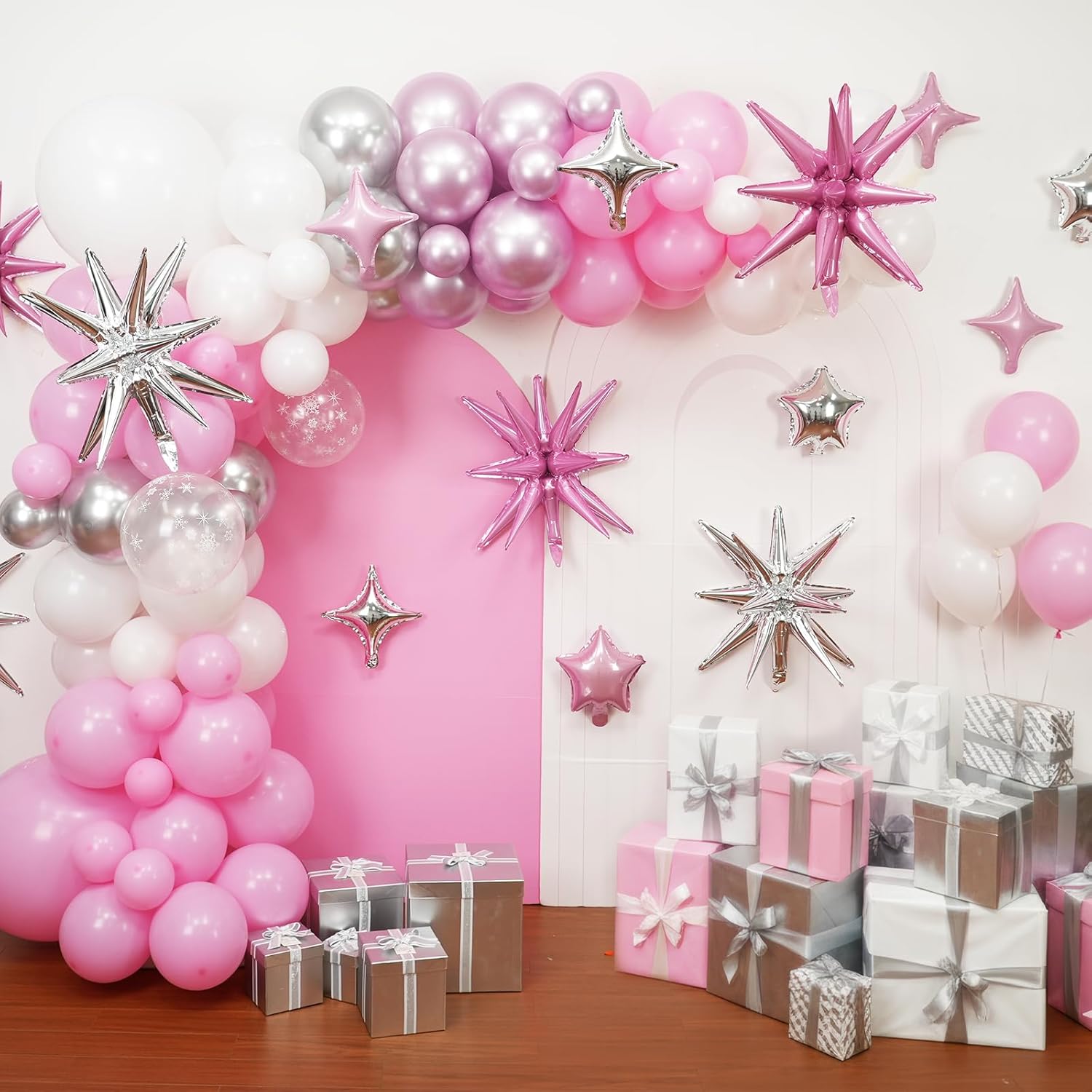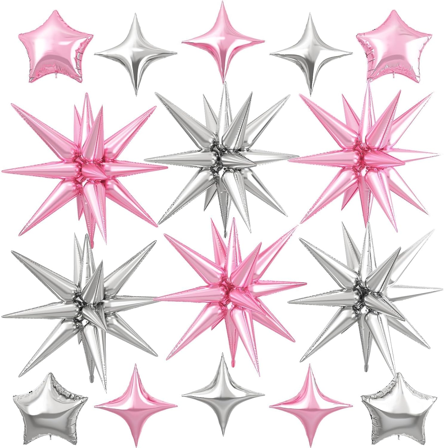 Pink Silver Star Balloon,16Pcs Star Foil Balloons Set with 22Inch Explosion Spike Cone Balloons and 10Inch Quadrangle Helium Balloon for Birthday Wedding Baby Shower Party Decorations