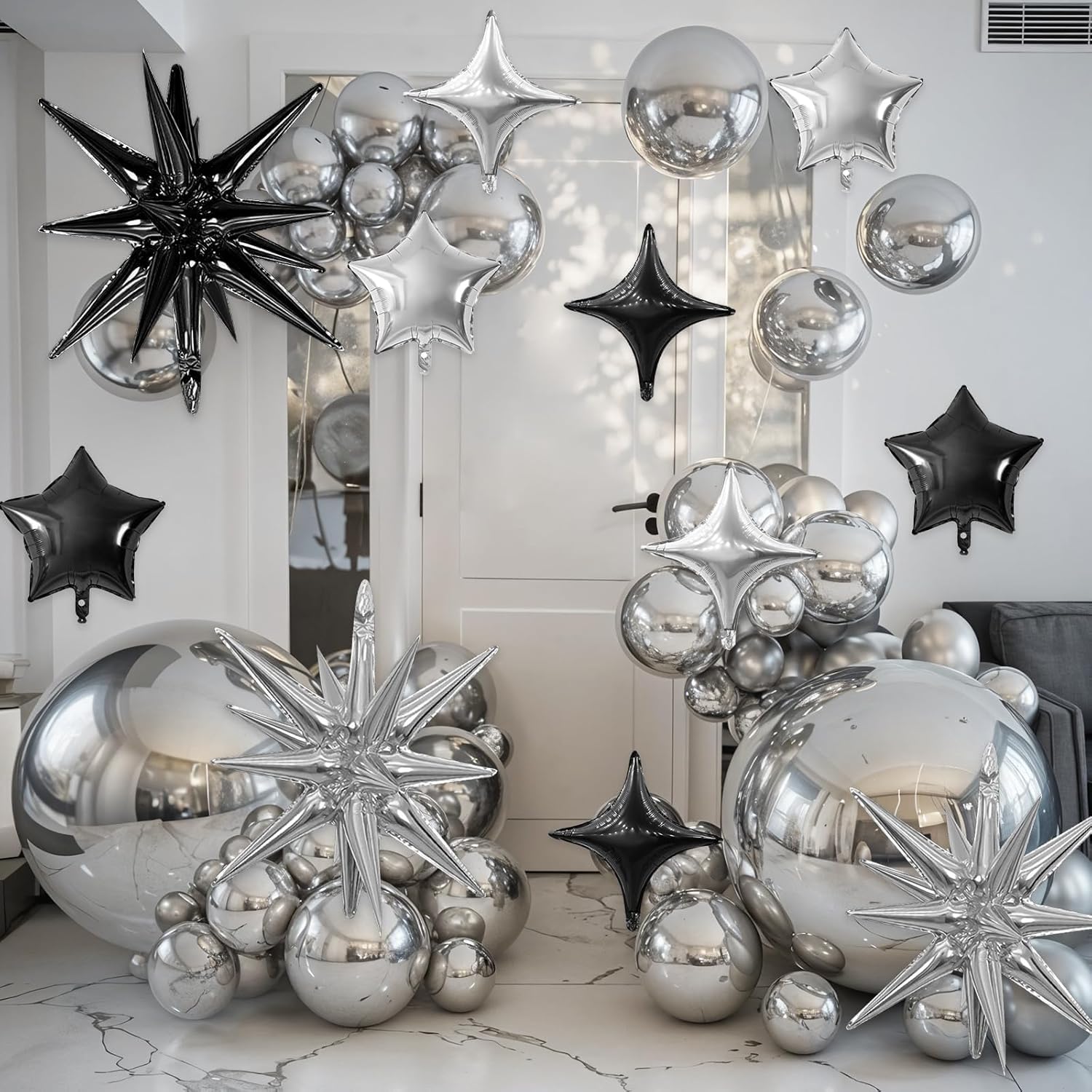 - Package: This set includes 6pcs 22inch explosion star foil balloons(black*3, silver*3), 4pcs 10inch star foil balloons(black*2, silver*2), 6pcs 10inch four angle star balloons(black*3, silver*3), and a ribbon. Perfect for creating a dazzling party atmosphere.