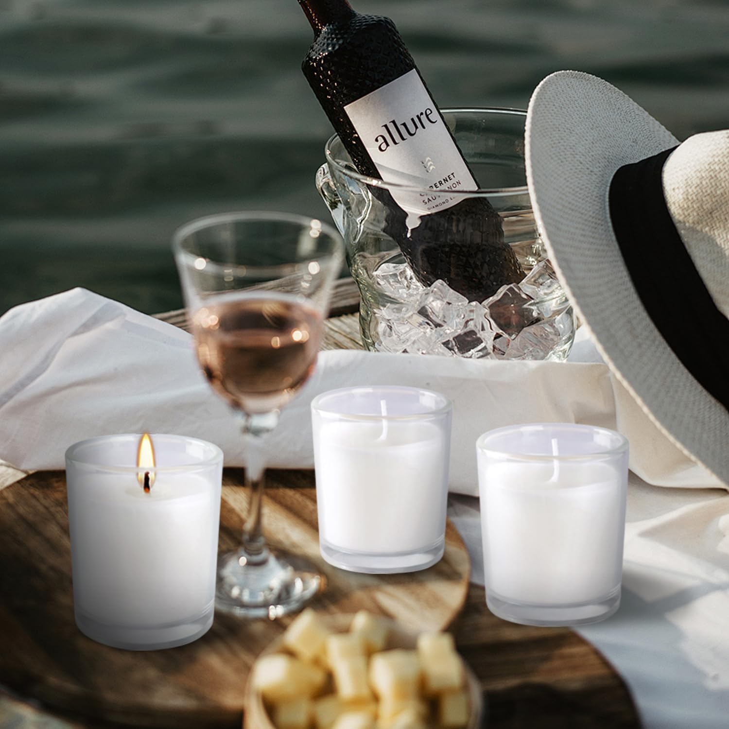 - γ48-Pack Elegant White Candlesγ This set includes 48 clean-burning white candles in sleek glass cups, perfect for weddings, home decor, outdoor party decor, restaurants, romantic ambiance, DIY decorations, birthdays and many other uses. It is also perfect for emergency use during power outages.