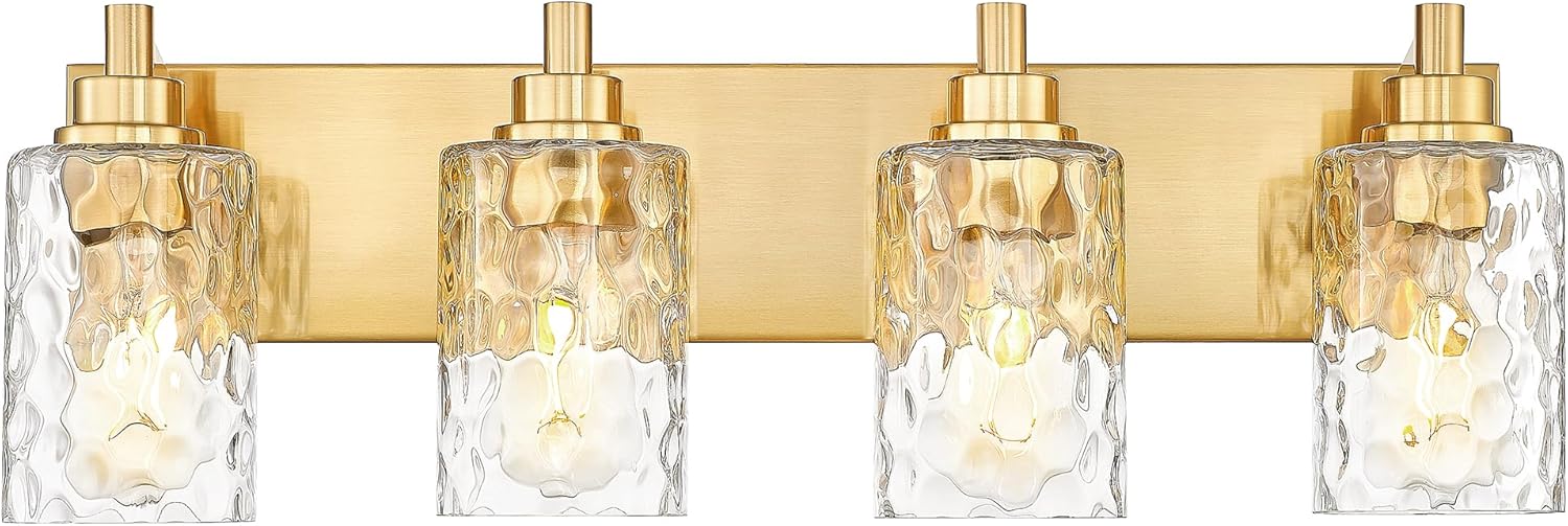 - Inspired Design: The 4-light bathroom vanity light feature a combination of clear hammered glass cylinder shades and a brushed gold metal long base back plate, creating a fusion of timeless elegance and modern minimalism. The bathroom lighting fixtures over mirror are sure to add a touch of unique charm and ambiance to your space