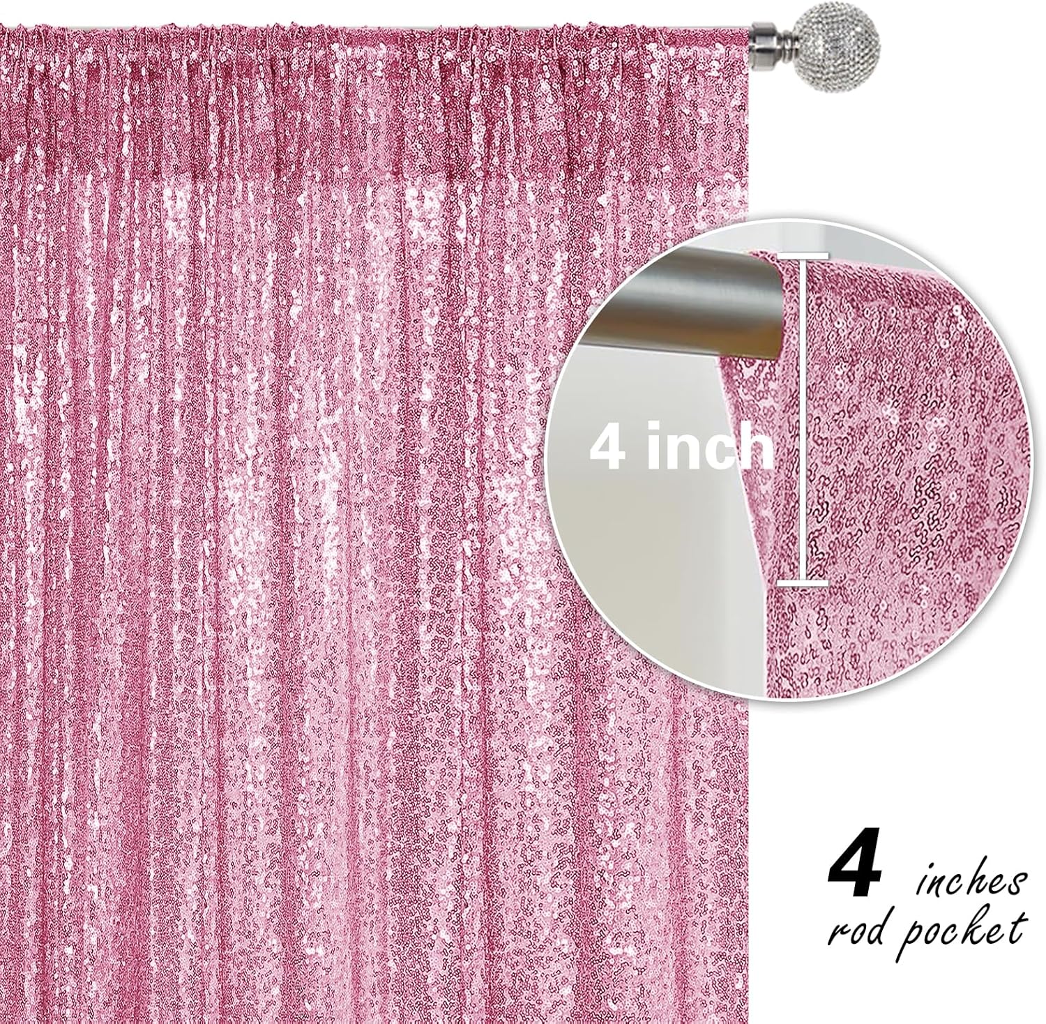 - Package Include: 2Pcs 2FT Wide X 8FT Height sequin backdrop curtain with a 4-inch wide rod pocket on the top, which is easy to install.