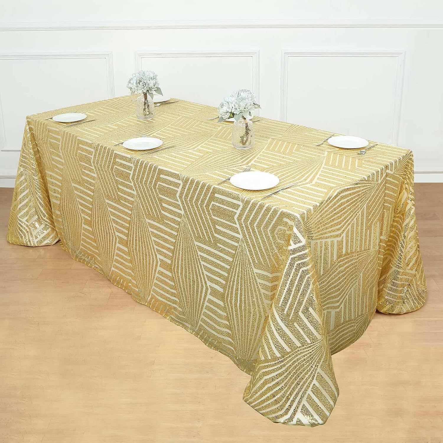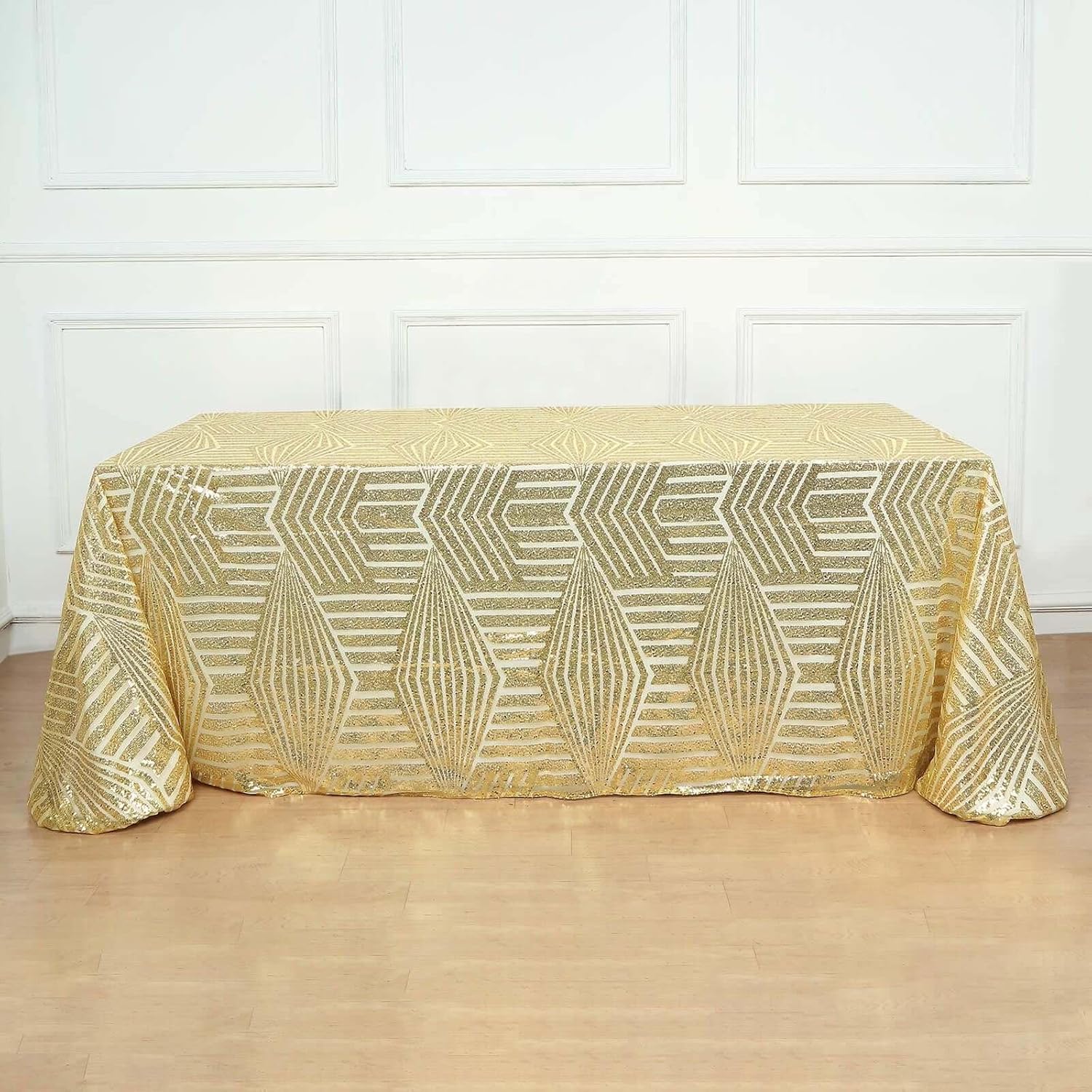 - Quantity: 1 Rectangle Tablecloth Material: Shiny Sequin Beads atop Tulle Net Fabric Color: Gold Style: Geometric Lines Pattern Size: 90" x 132" Edges: Hemmed Seamless 1pc Design Gives floor length hang on 6ft (30"x72") rectangle tables