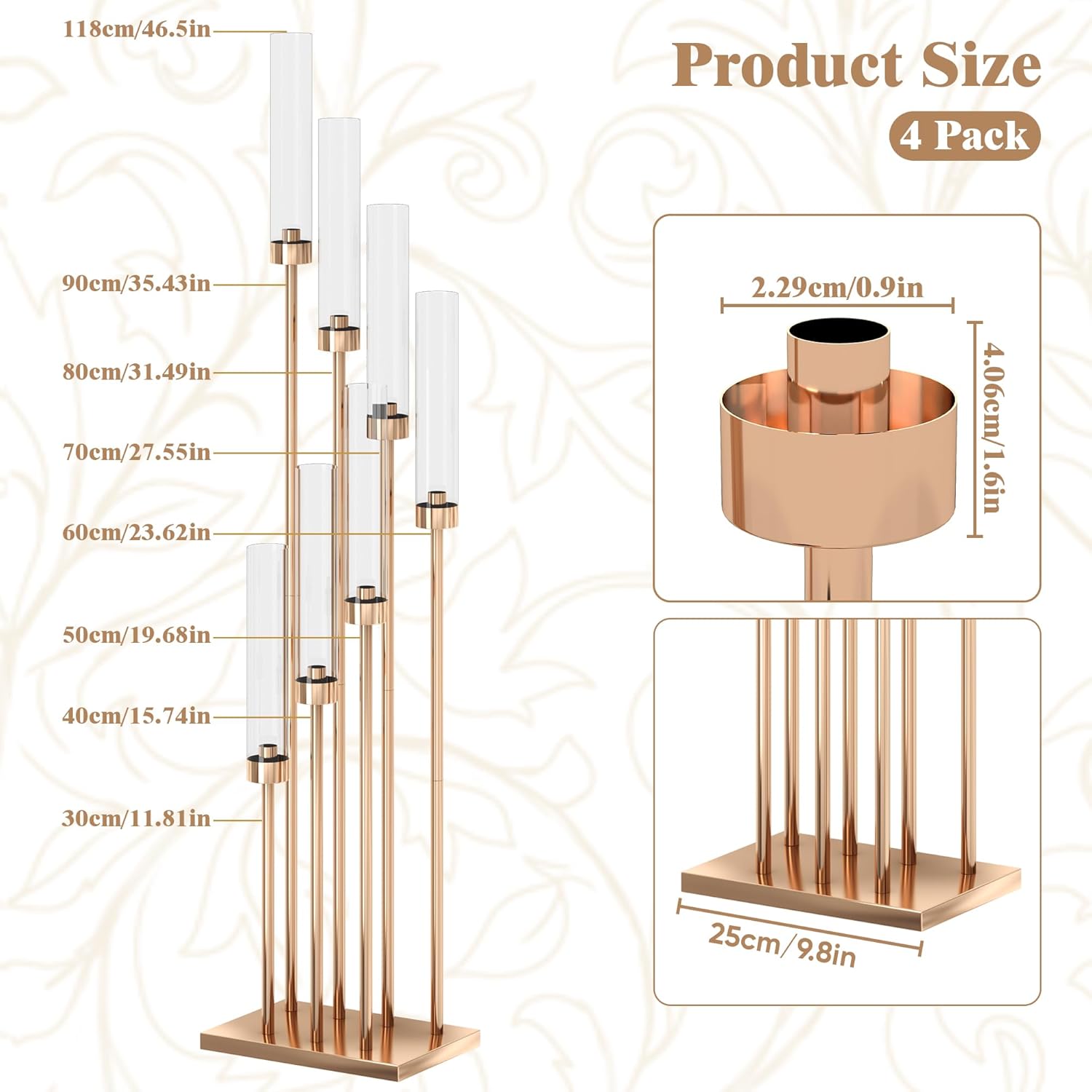 - MULTIPLE SIZES: The total height of our metal candlestick set is 118cm/46.5in, the height of the 7-arm tall candlestick is 22.8in, 26.7in, 30.7in, 34.6 in, 38.6 in, 42.5 in, 46.5in, and the size of the bottom of the square shape is 7x11in