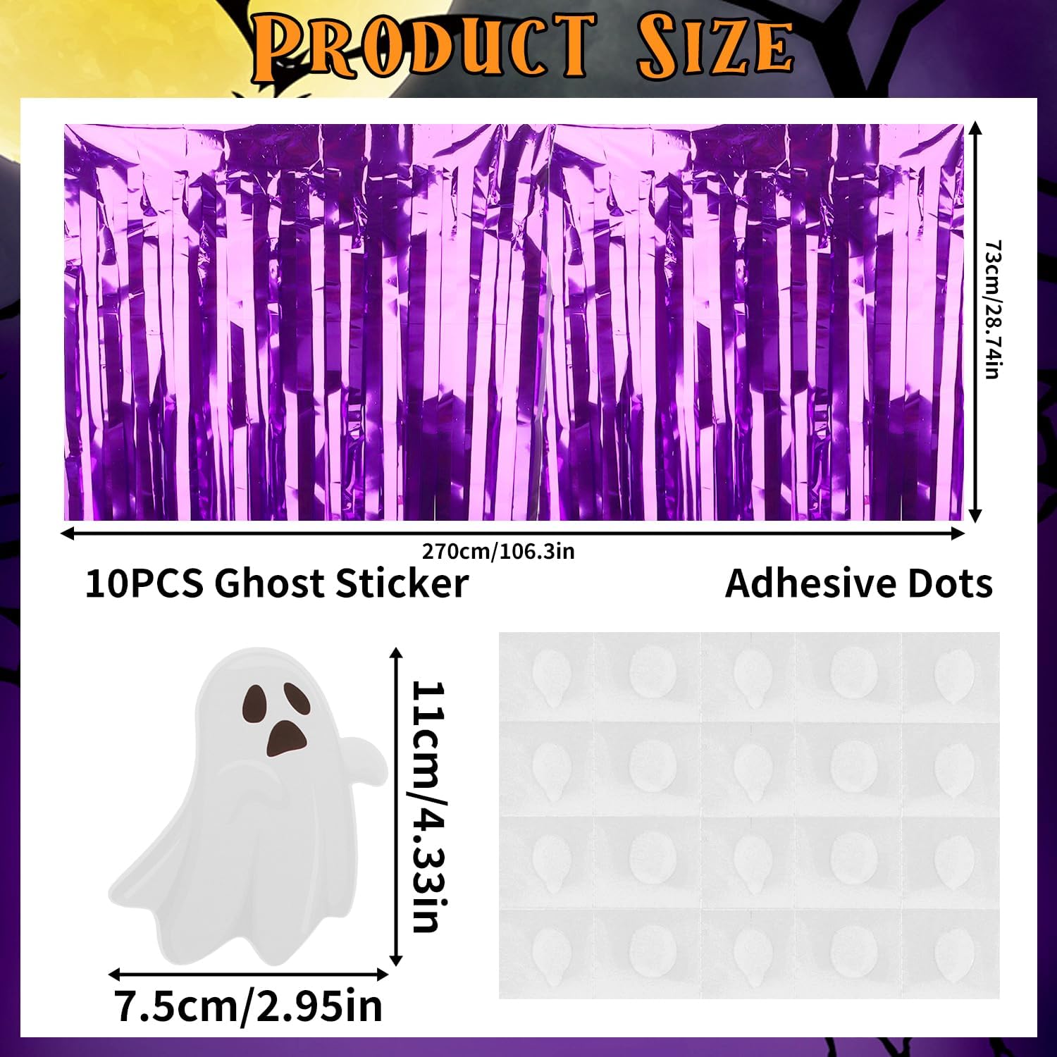 - The packaging includes: 1 pack metallic foil tassel table cover 28.74x106.3 inches, which is enough to decorate your halloween party, provide you with excellent convenient installation: the halloween table cloth is equipped with self-adhesive tape. Just tear off the tape and paste it. There are ten ghost stickers, 2.95x4.33 inches, and adhesive dots provided in the package for sticking the stickers onto the halloween tablecloth. The installation is convenient and quick. It can be pasted on the edge of your round table or rectangular table. It can be easily cut into any siz.