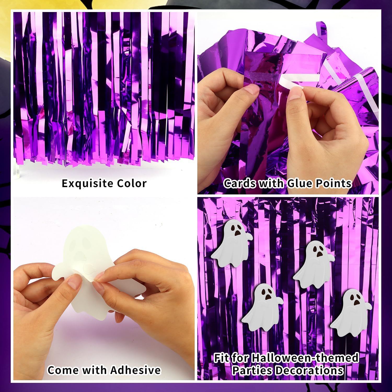 - Multi-color options: the purple table cover with ghost decorations is shiny and bright. The foil fringe table skirts provide a variety of color options, to meet different halloween atmosphere needs. The purple table cloth adds a mysterious touch to halloween.
