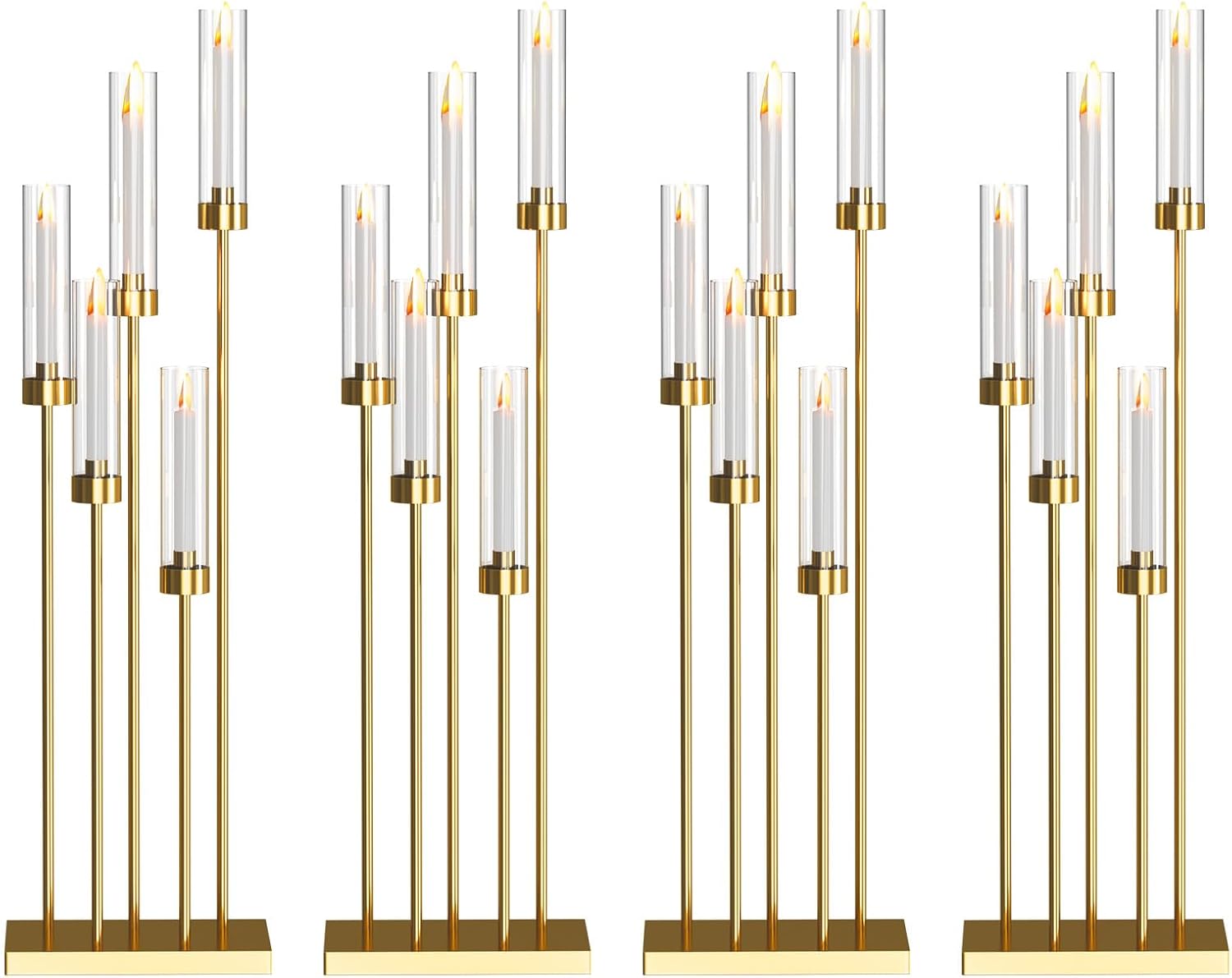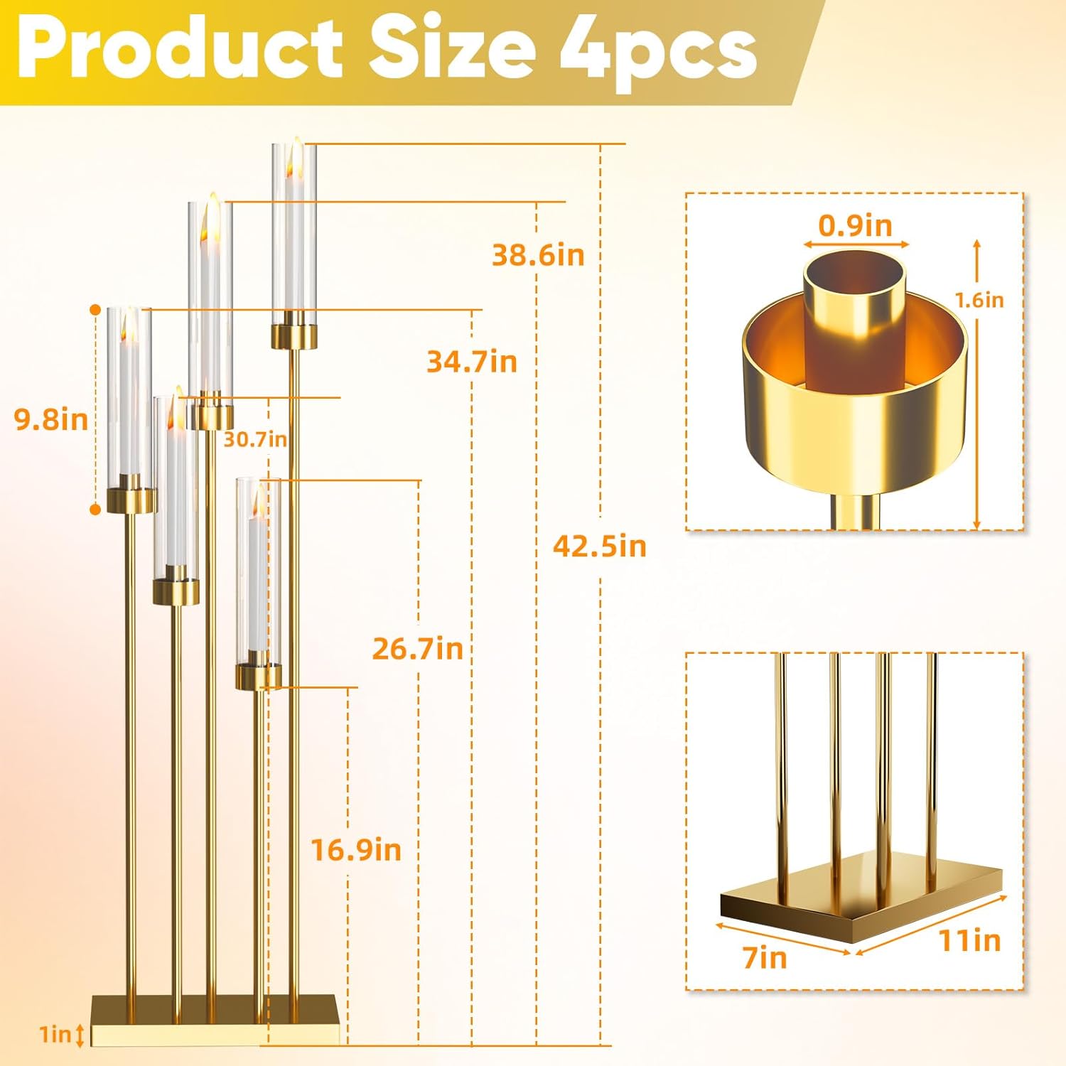 - UNIQUE DESIGN: Our 4pcs floor candle holders for wedding is 5 arms, staggered, very unique, the appearance is golden, elegant and noble. The matching transparent acrylic cover adds a bit of elegance to the whole product. Note: Our products feature a protective film on the bottom. Simply peel it off to reveal the gold finish. This film is included to prevent scratches on the product