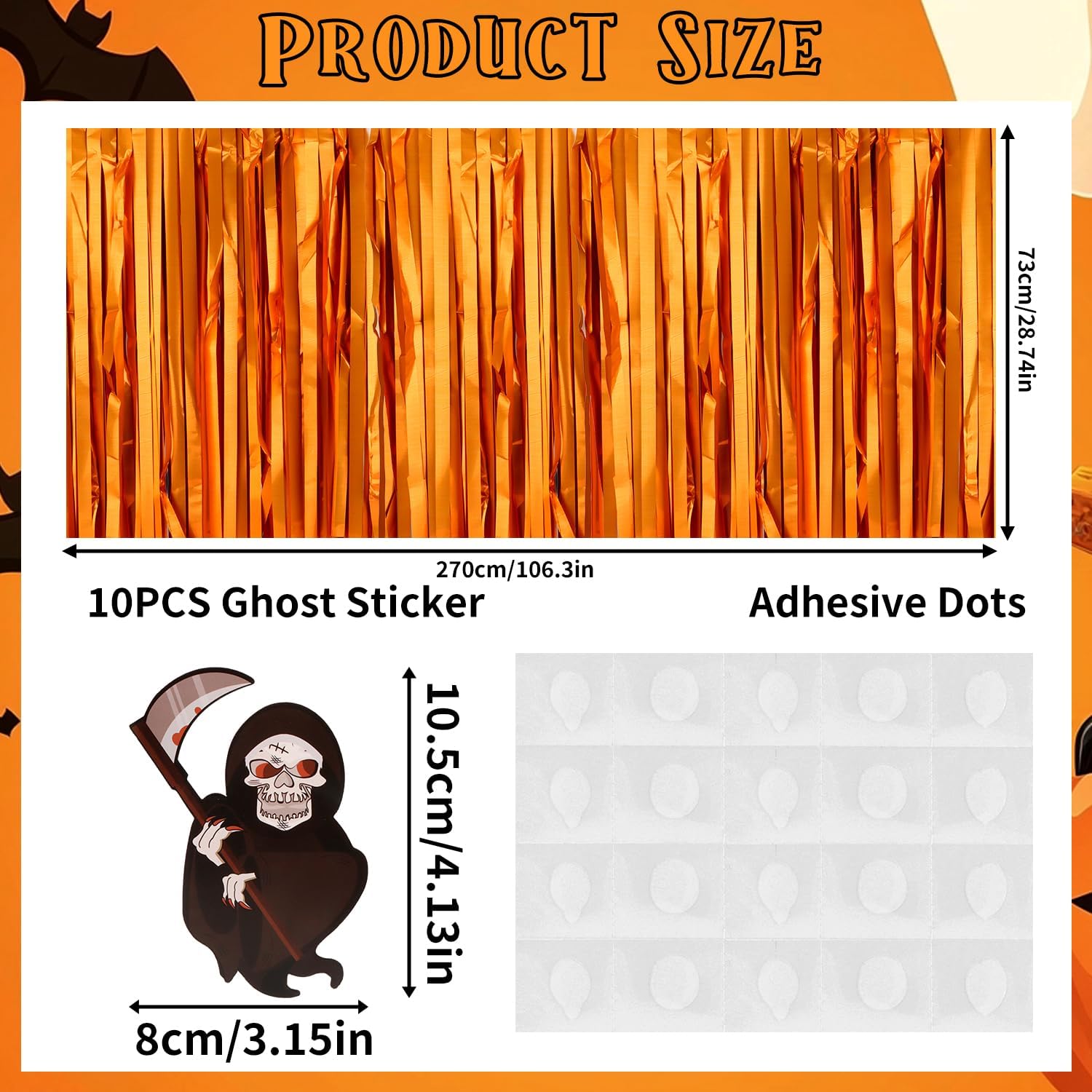 - The packaging includes: 1 pack metallic foil tassel table cover 28.74x106.3 inches, which is enough to decorate your halloween party, provide you with excellent convenient installation: the halloween table cloth is equipped with self-adhesive tape. Just tear off the tape and paste it. There are ten skull stickers, 3.15x4.13 inches, and adhesive dots provided in the package for sticking the stickers onto the halloween tablecloth. The installation is convenient and quick. It can be pasted on the edge of your round table or rectangular table. It can be easily cut into any siz.