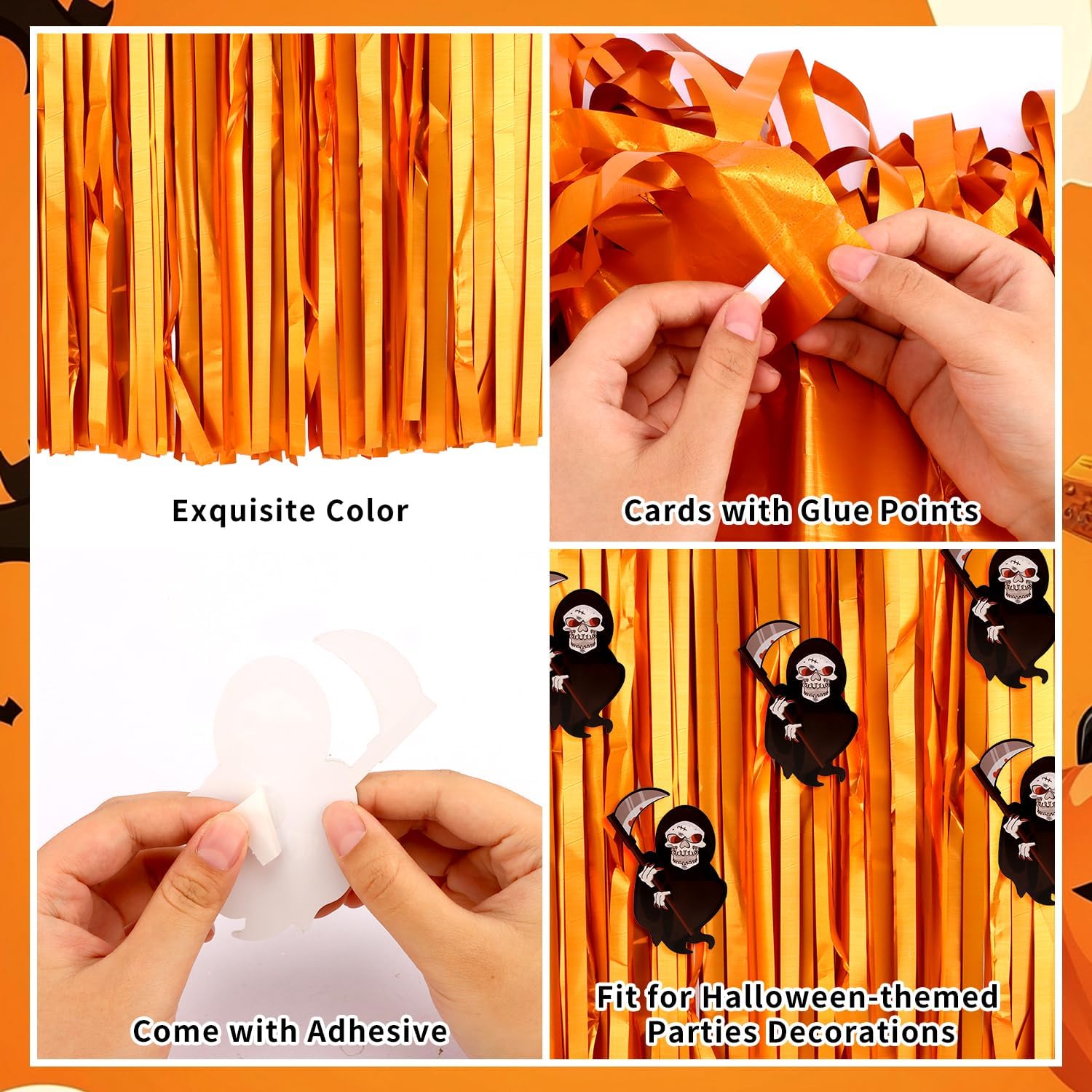- Use tips: you can cut the foil fringe orange halloween streamers with scissors into the suitable length, assemble the party streamers side by side to make the scope larger. If you want to make your party table decorations look fuller and thicker, you can overlap two table skirts, also overlap sequin table cloth in different colors to create a beautiful party easily.