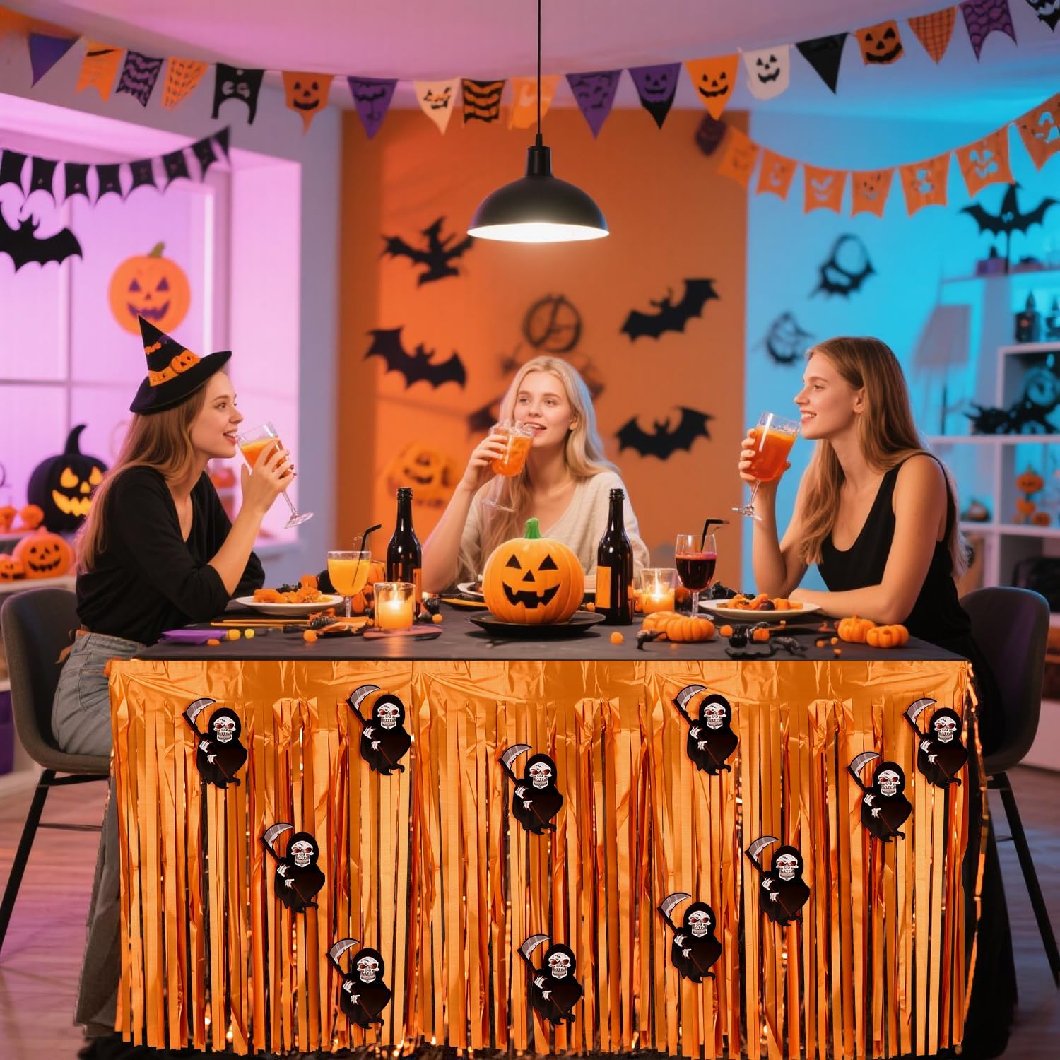 - Halloween table decorations: the orange tablecloth is a necessary complement for halloween themed party. These halloween table skirting with skull decorations will enhance the festive atmosphere, with large quantity and quality material, you deserve them.