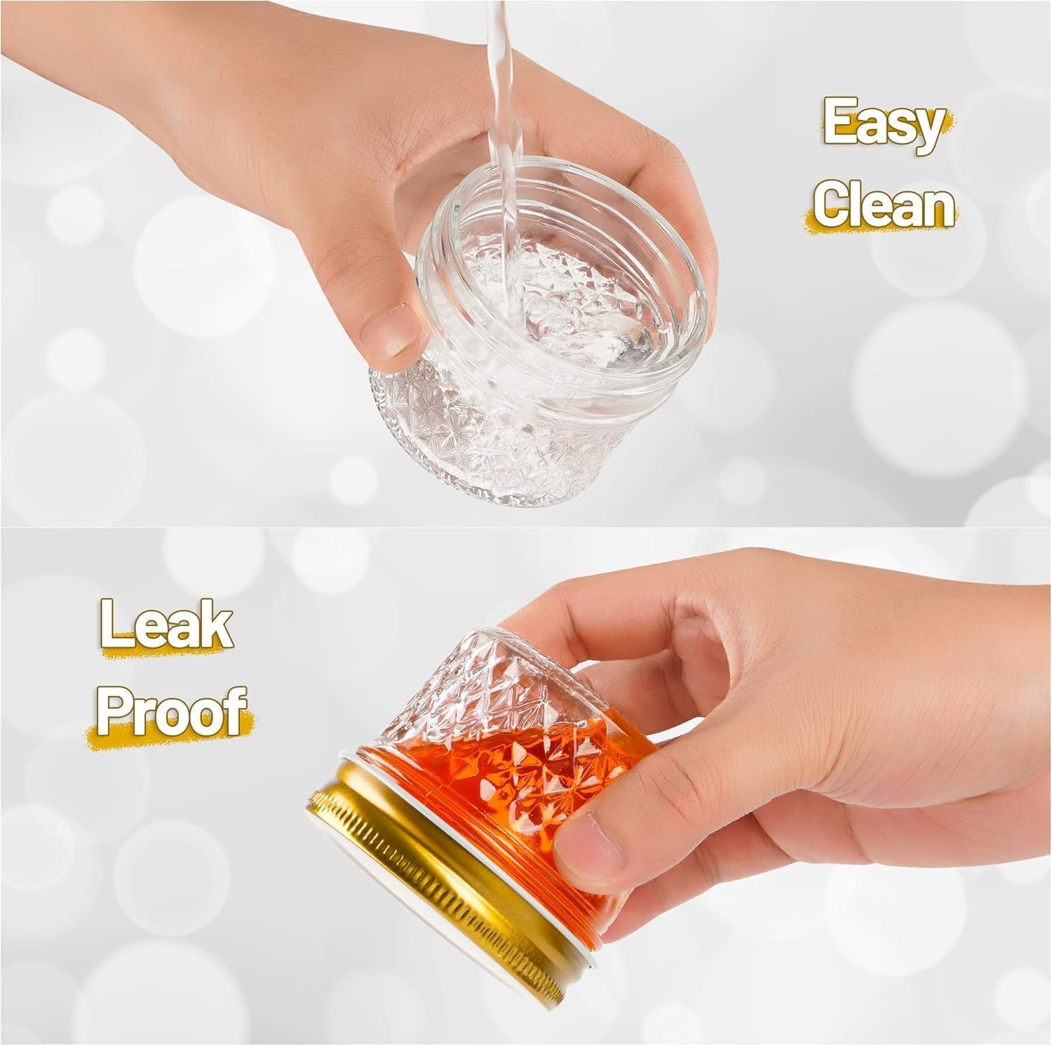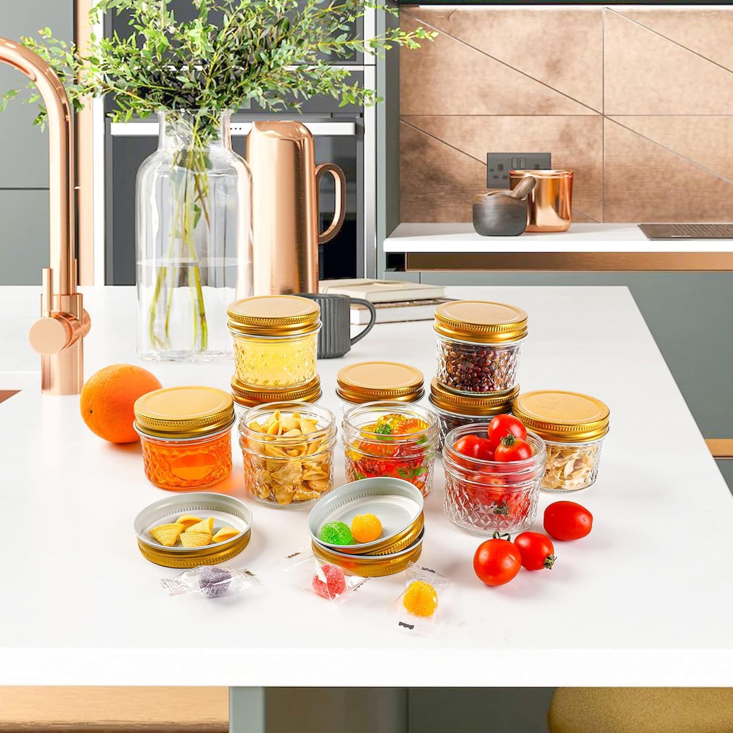 - High Quality Glass Jars: Our 4 oz mason jars come with 12 reliable lids.Made of durable glass, BPA free food safe grade glass. Diamond pattern design,exquisite appearance.Easy to grip.The jars are clearly visible and perfect for food storage, drinks, canning and fermentation making.Great for a gift set.Durable glass make it last for years.