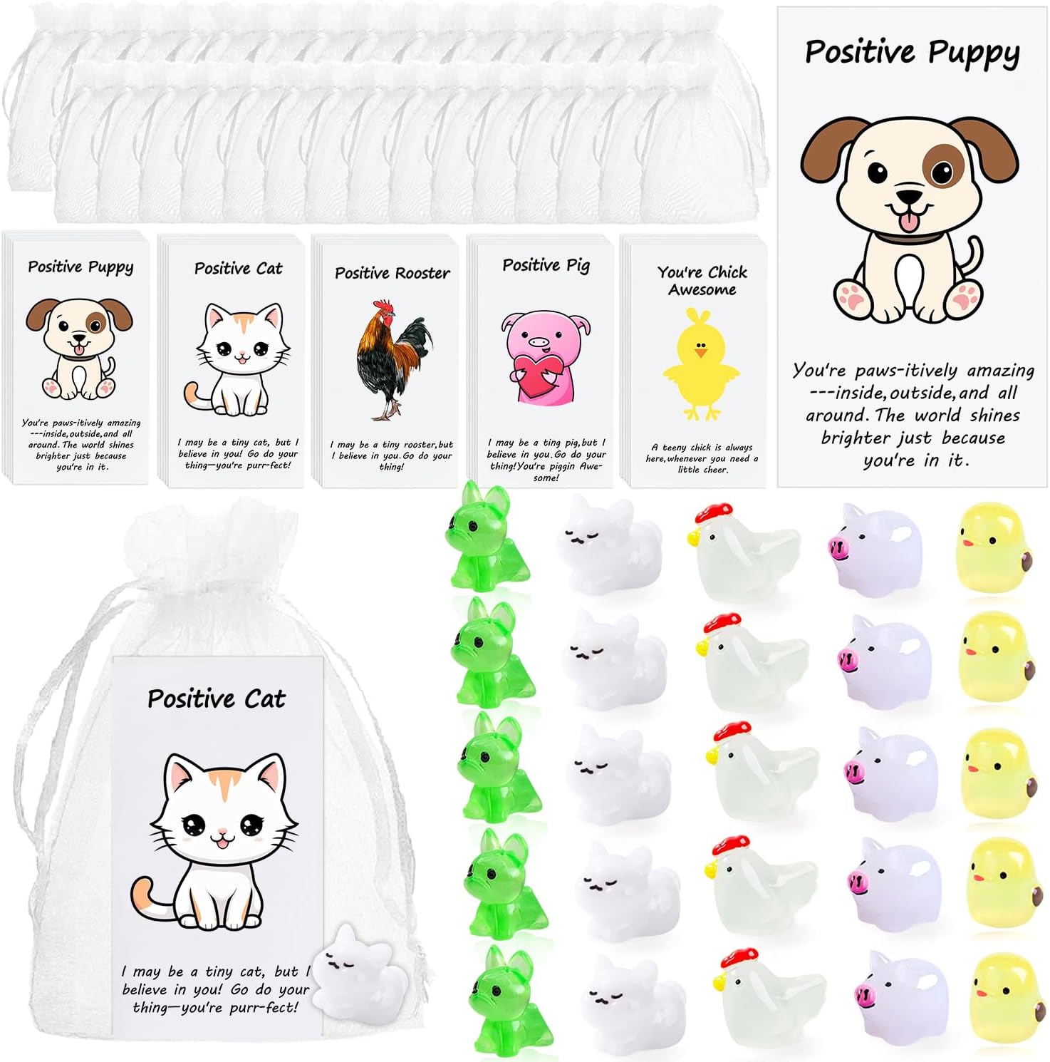 - âś… Employee Thank You Gifts Bulk Set - We will provide you with a total of 20 pieces of employee appreciation gifts, including 20 positive resin animals, 20 cards and 20 organza bags;our group gifts for coworkers/back to school gifts for students are designed 5 different resin accessories with different cards,including pigs, dogs, cats, hens, chickens with funny pun quotes,to express your gratitude and encouragement; Sufficient quantities can easily meet your gift-giving needs.