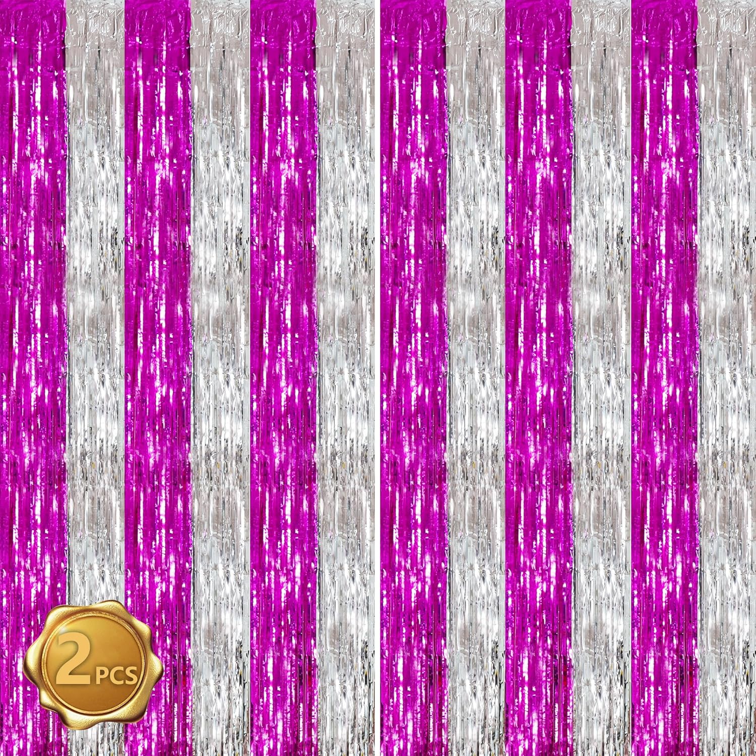 BEISHIDA Hot Pink Silver Door Streamers Backdrop Foil Fringe Tinsel Party Streamers Curtains Photo Backdrop - 2Pcs for Birthday Graduation Bachelorette Party Decoations