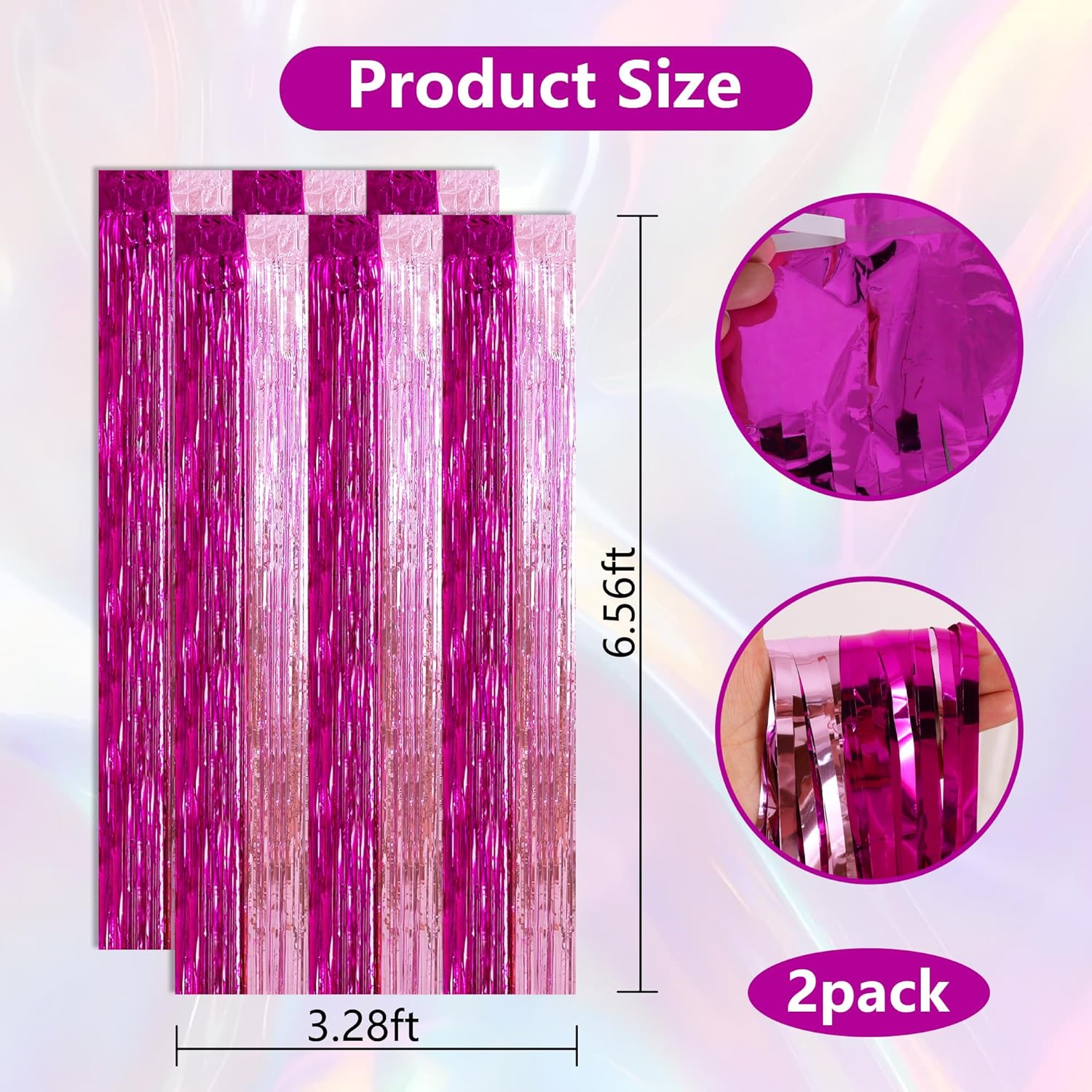BEISHIDA Hot Pink Pink Door Streamers Backdrop Foil Fringe Tinsel Party Streamers Curtains Photo Backdrop -2Pcs for Birthday Graduation Bachelorette Party Decoations