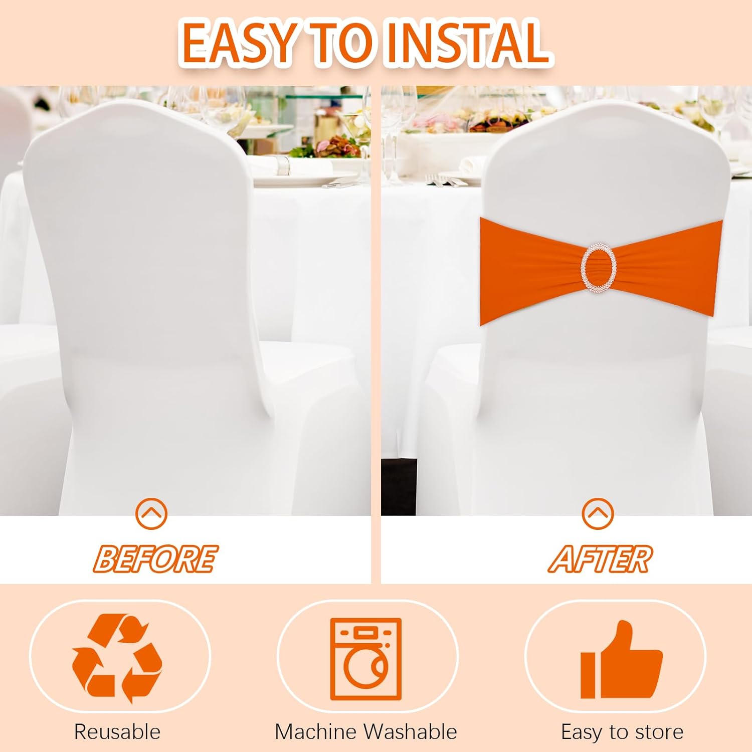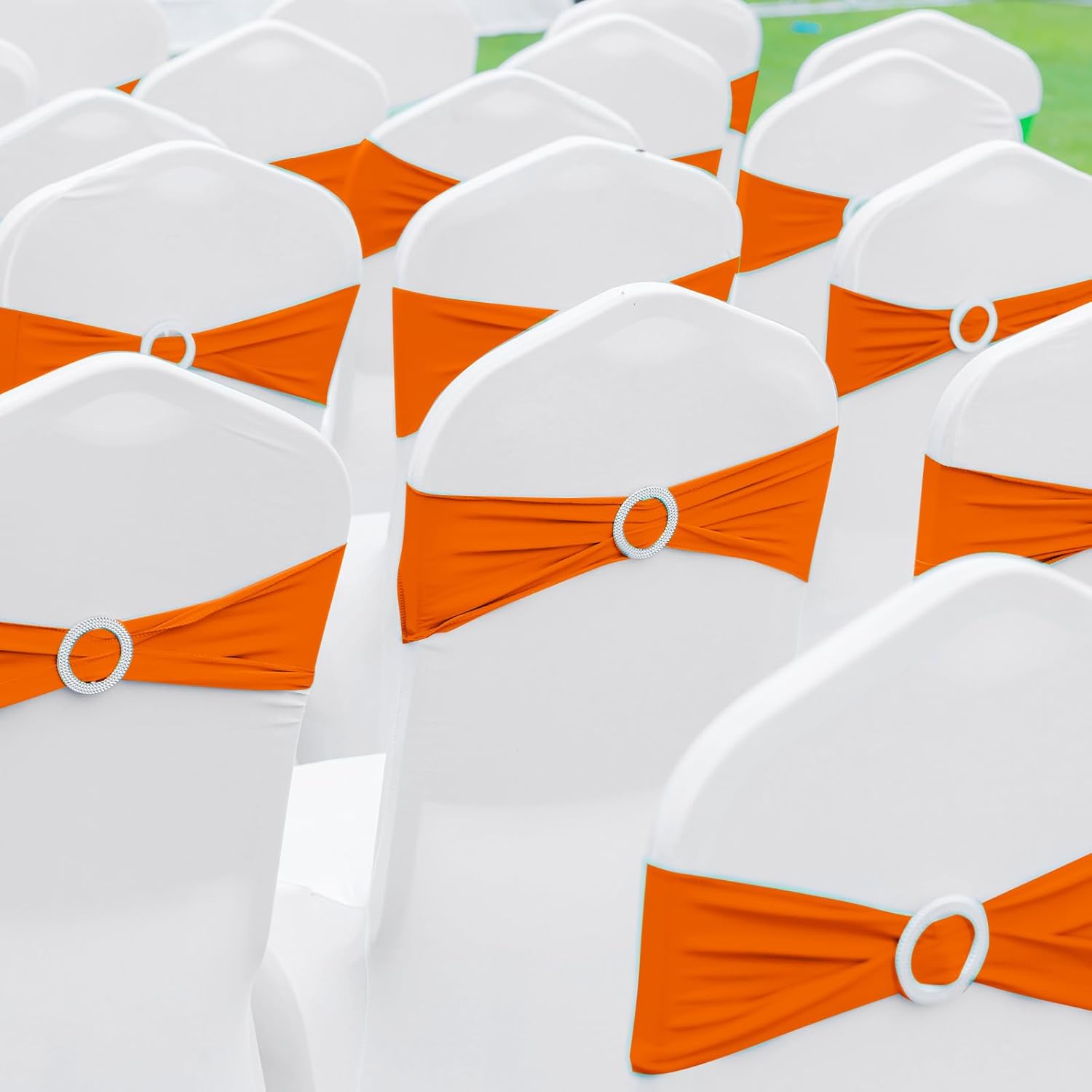 CHENGU 150 Pieces Spandex Stretch Chair Sashes Bows Elastic Chair Cover Bands Ties with Buckle Slider for Wedding Party Reception Events Universal Ceremony Banquet Decorations (Orange)