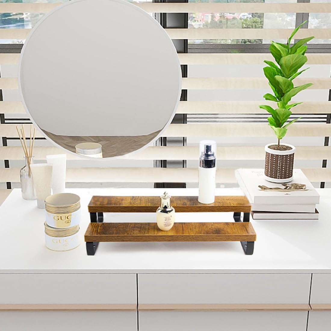 4-Tier Wooden Display Riser Shelf Stand for, Makeup, Cupcake, Condiment & Dolls Collection Home Decor Organizer, Expandable for Pantry/Counter (Brown, 2-Tier)