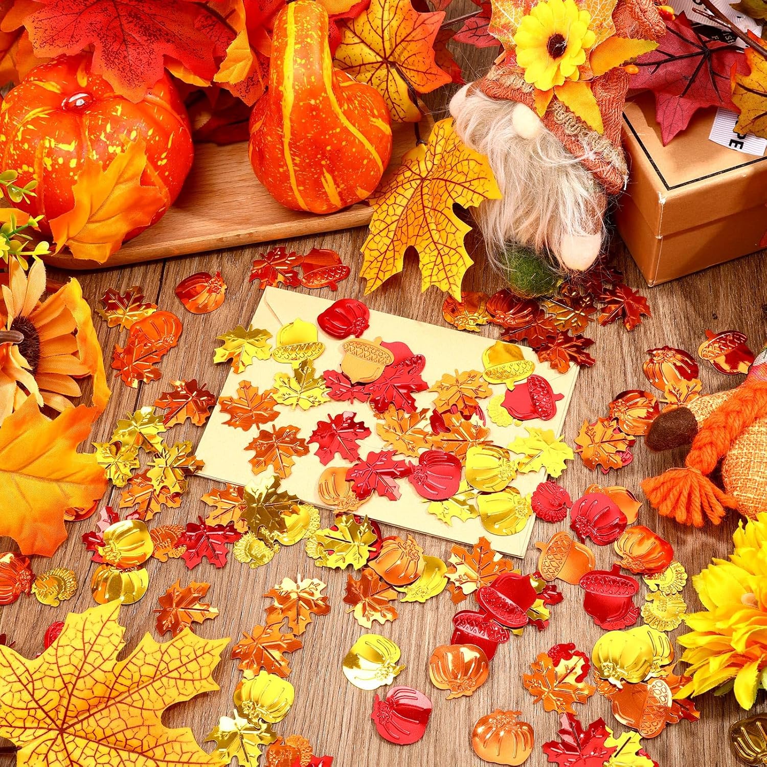 - Creative Use: Autumn confetti is not only suitable as decoration for autumn parties and festivals, but also very ideal for decorating personal scrapbooks or DIY art projects. You can use the fall confetti to decorate gift bags, gift baskets, add unique charm to gifts, and also be used for various handmade crafts to unleash unlimited creativity