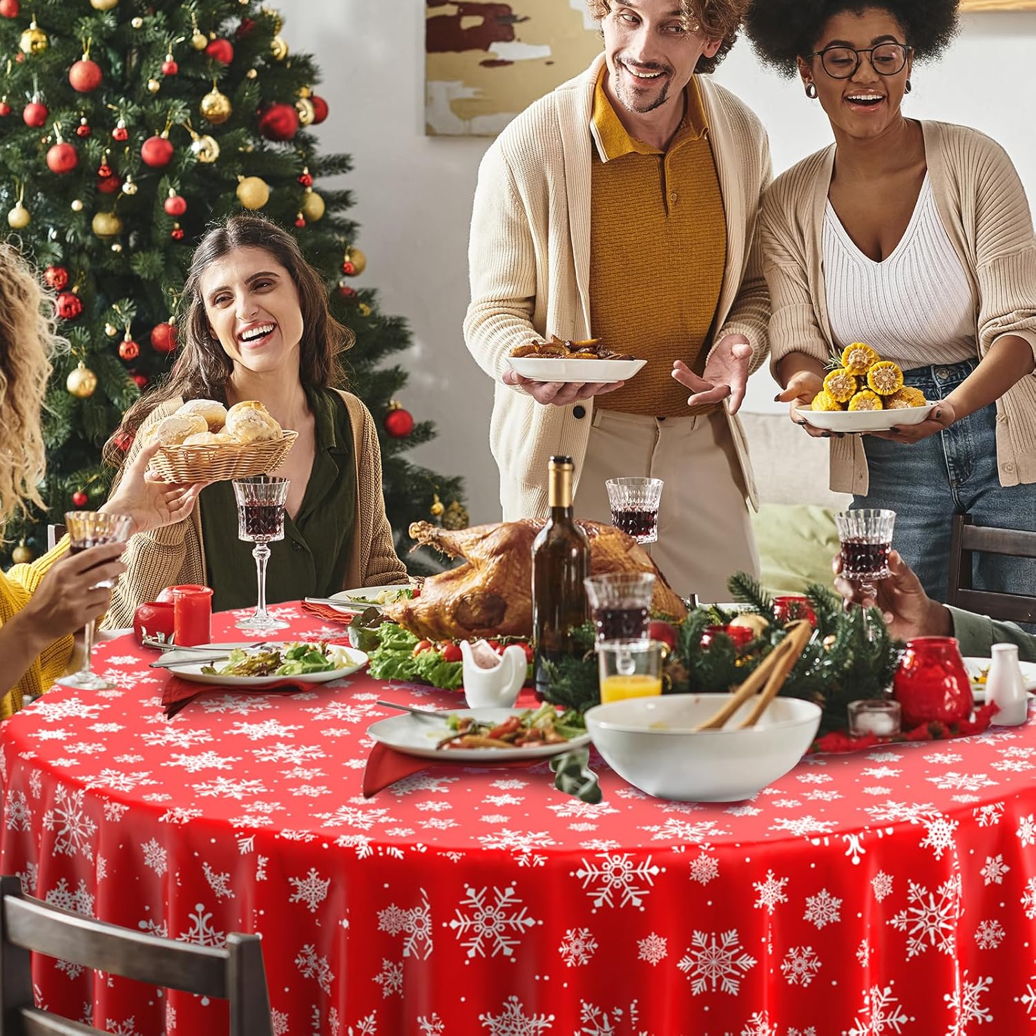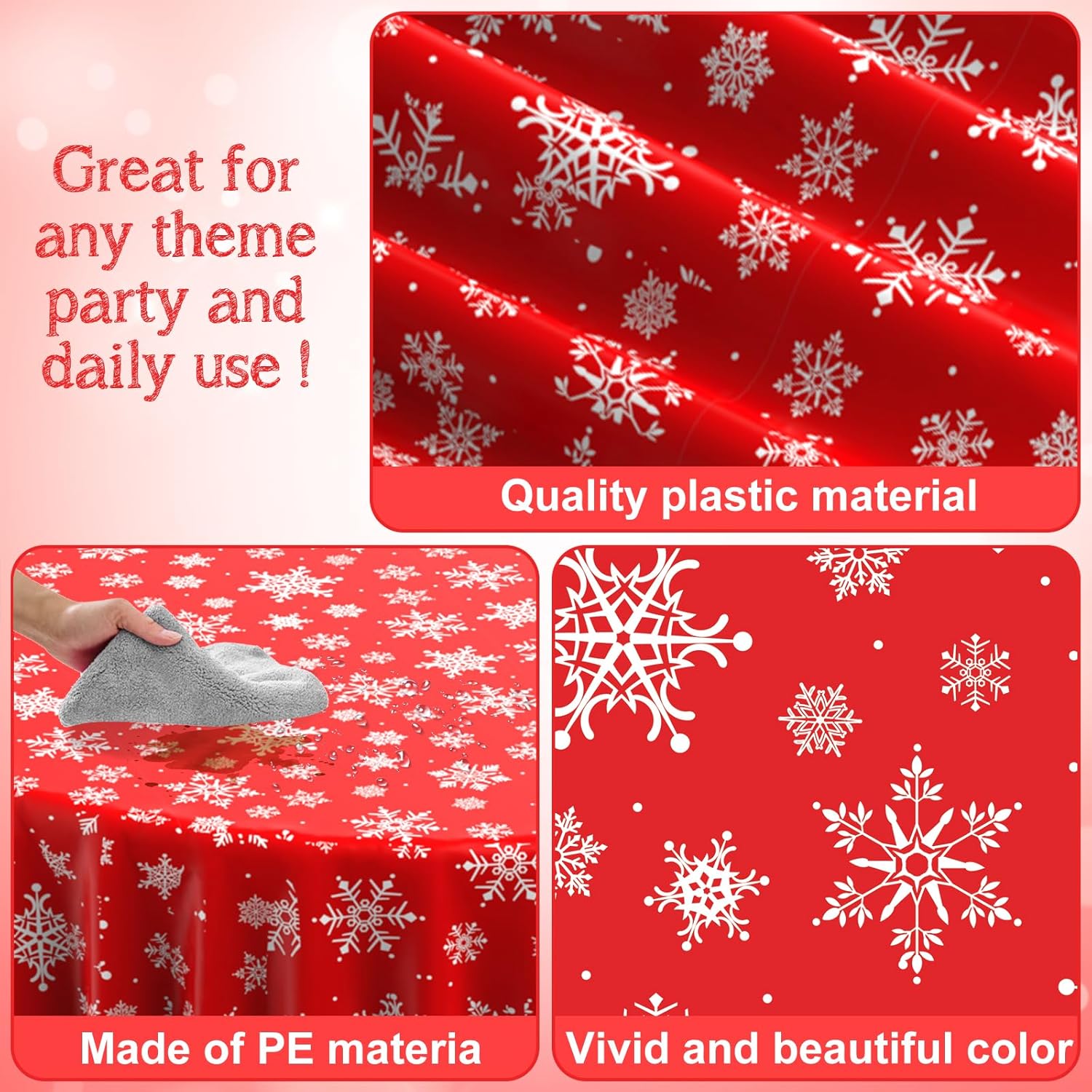 - Extra large size: these red snowflake Christmas party tablecloth measures approx. 84 inch, which fits for various-sized tables that can accommodate 8-10 people, It’s large enough for your to hold a winter holiday and Christmas theme party with your family and friends to share happiness