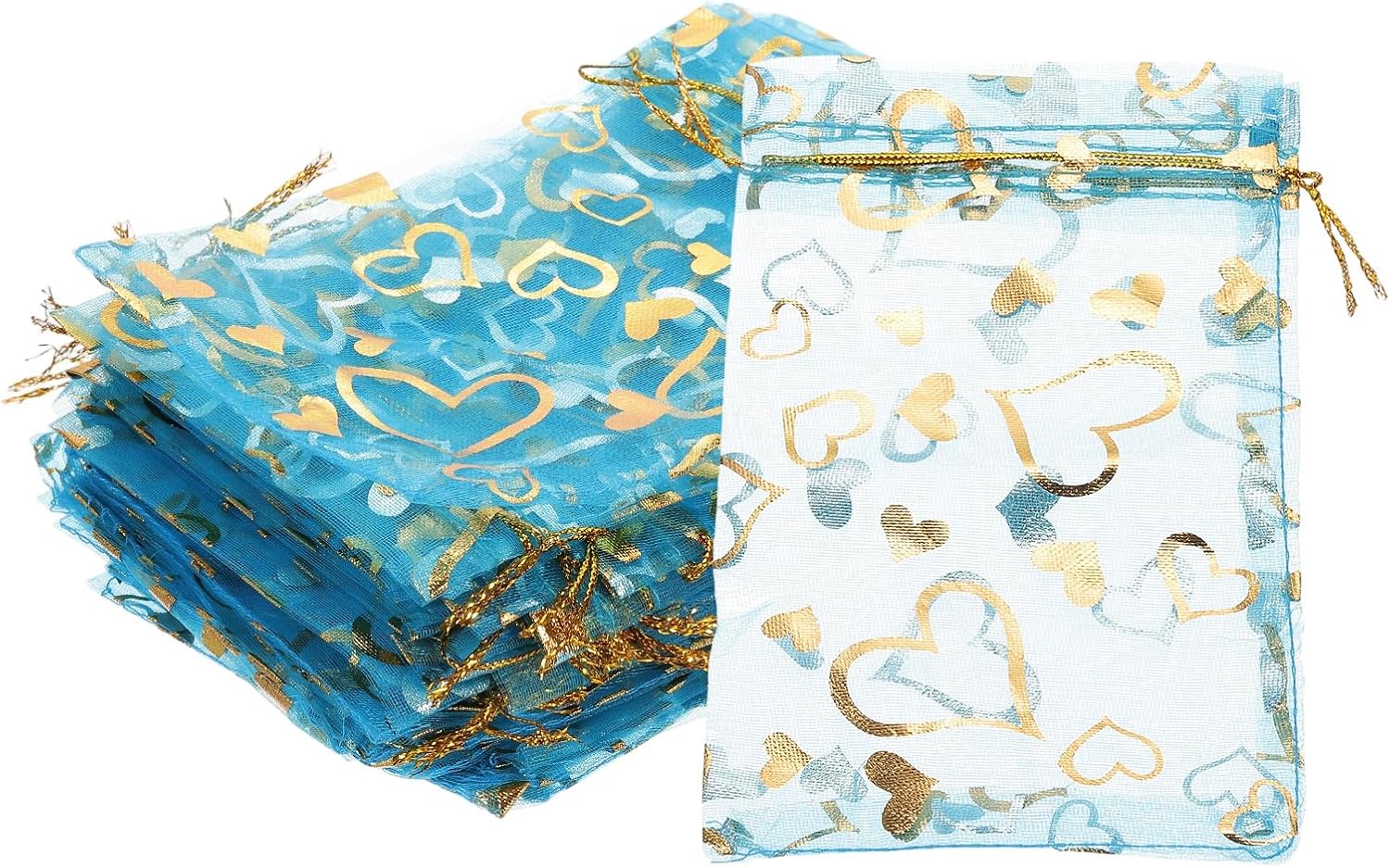 - Color: Lake Blue; Material: Polyester; Size: 16x11 cm/6.3x4.33 Inch(L*W); Packing List: 100 Pcs x Heart Printed Organza Bags (NOTE: Please confirm the size before choosing our product)
