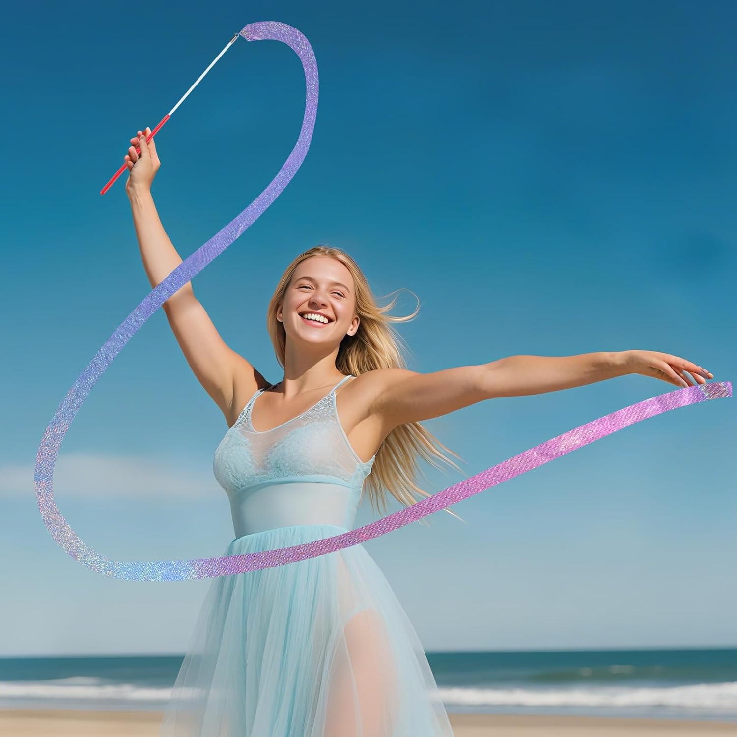 - Exquisite design: The dance streamers showcase a charming blue-purple gradient, blending beauty and style. Their glittering surface makes them even more appealing. Whether waved or spun on sunny, breezy days, the sparkling dance ribbon streamers create a stunning, dynamic display.