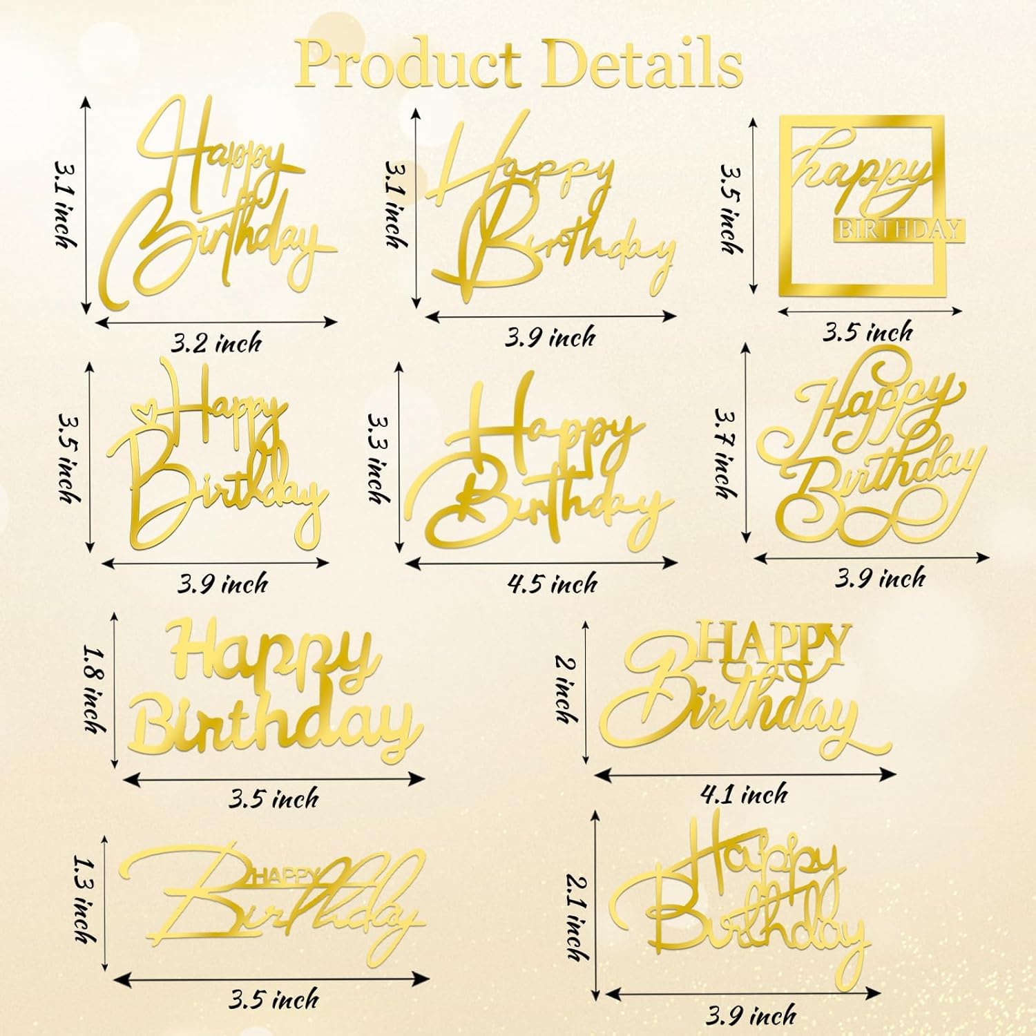 - Package Include: You'll get 10 Pcs "Happy Birthday" letter cake toppers with 10 different styles. Made from high-quality acrylic, it can be reused and is more durable than other paper toppers. It can be easily stored and reused for the next use