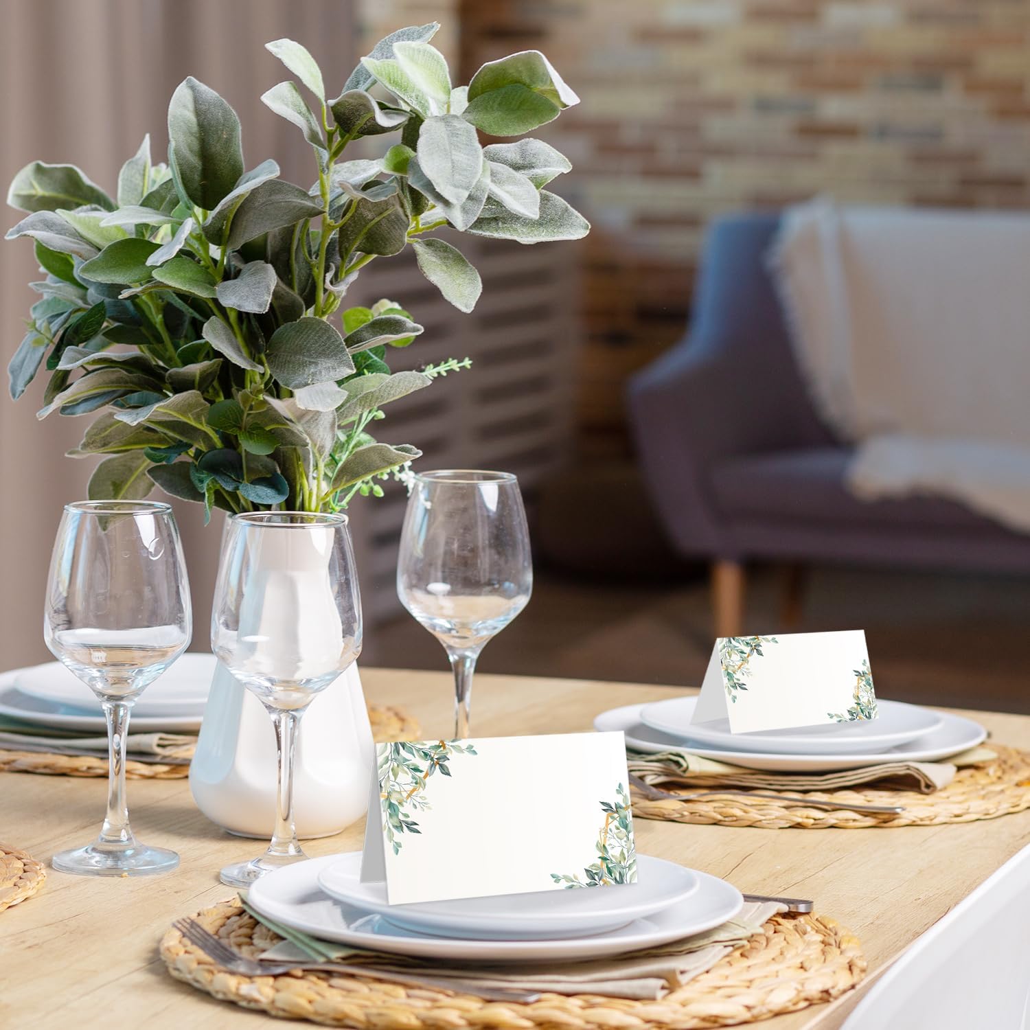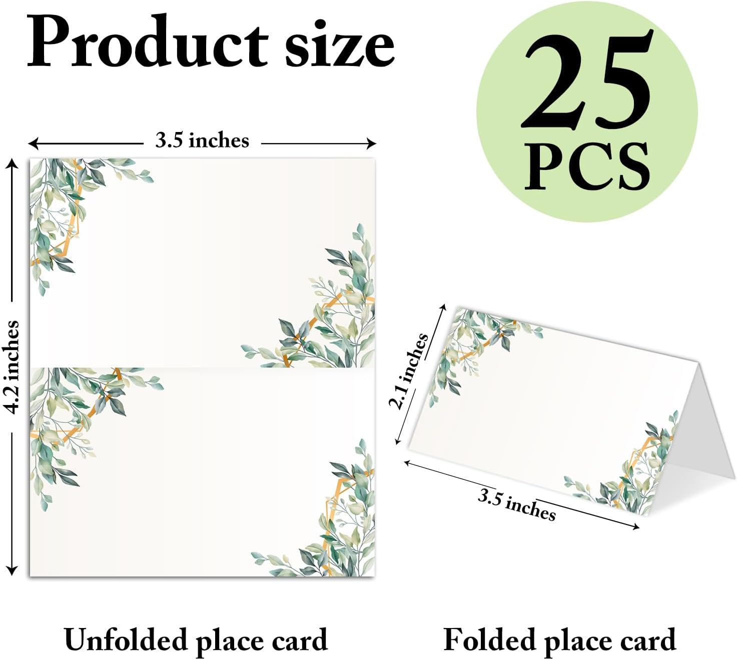 25 Pack Greenery Place Cards, Editable Name Cards for Table Setting, Tent Cards Food Label for Dinner Party, Bridal Shower, Wedding, Baby Shower and Events -T08