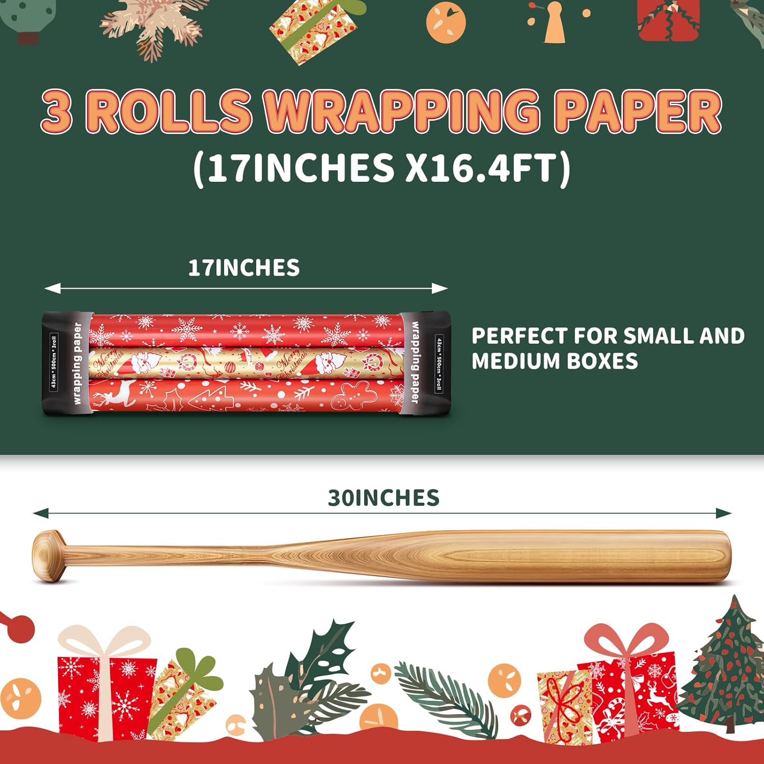 - [3 Packs 16.4ft Christmas Gift Paper] There are a total of 3 rolls of Christmas gift paper, each roll is 17 inches wide and 16.5ft long, totaling 70 square feet! Very suitable for family gift giving and gift giving between friends!