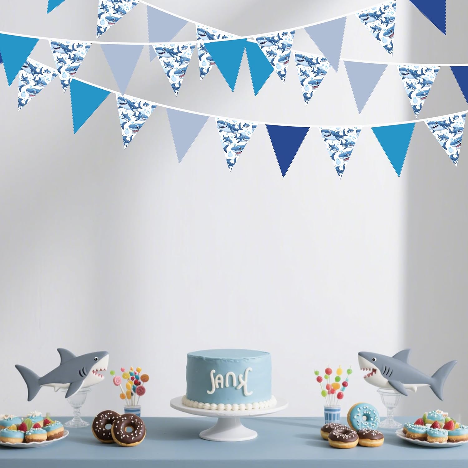 32Ft Shark Party Decorations Blue Cute Shark Triangle Flag Pennant Banner Fabric Garland Streamer for Kids Boys Ocean Birthday Sea Animal Nautical Baby Shower Under The Sea Party Decor Supplies
