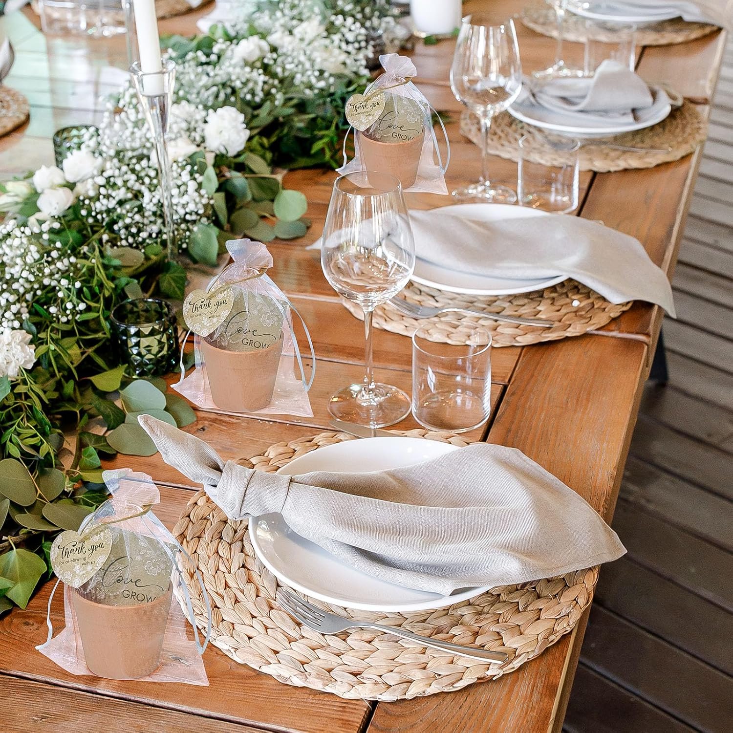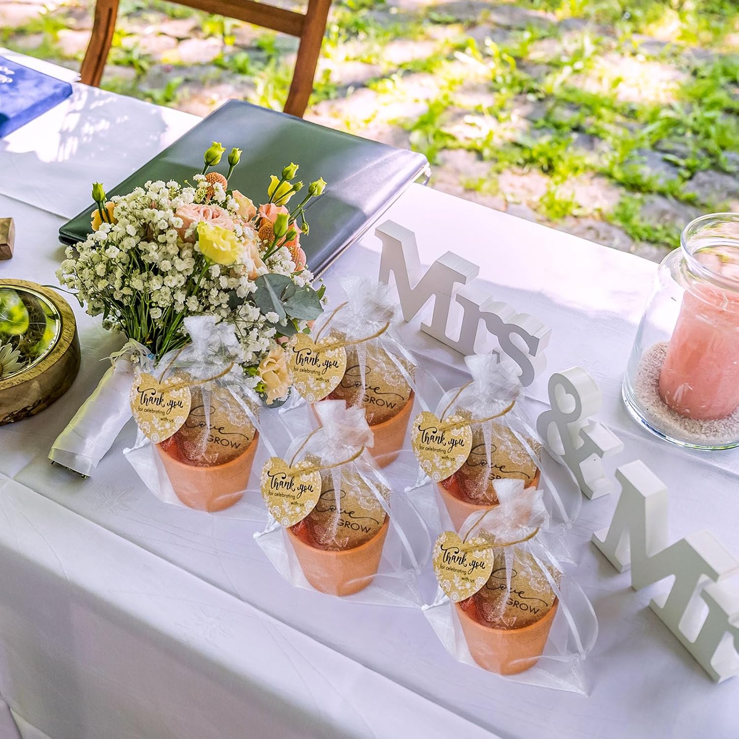 - Wedding Favor Set: This Let Love Grow wedding favor set includes everything you need: 50 plastic flower pots (2.36x2.75 inches), 50 seed envelopes (2.36x3.54 inches, seeds not included), 50 thank you tag pendants (2 inches), 50 organza gift bags (5.12 x7.09 inches), 1 roll of jute twine, and 50 plant labels. A thoughtful and meaningful gift for your guests.
