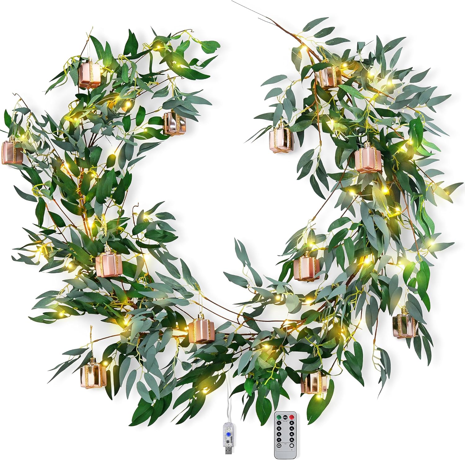Artificial Willow Garland with USB Fairy String Lights & Pink Gift Box Ornaments – 2-Pack Lighted Greenery Vine, with Remote for Mantels, Weddings, Fireplace, Holidays, Parties & Everyday Home Decor