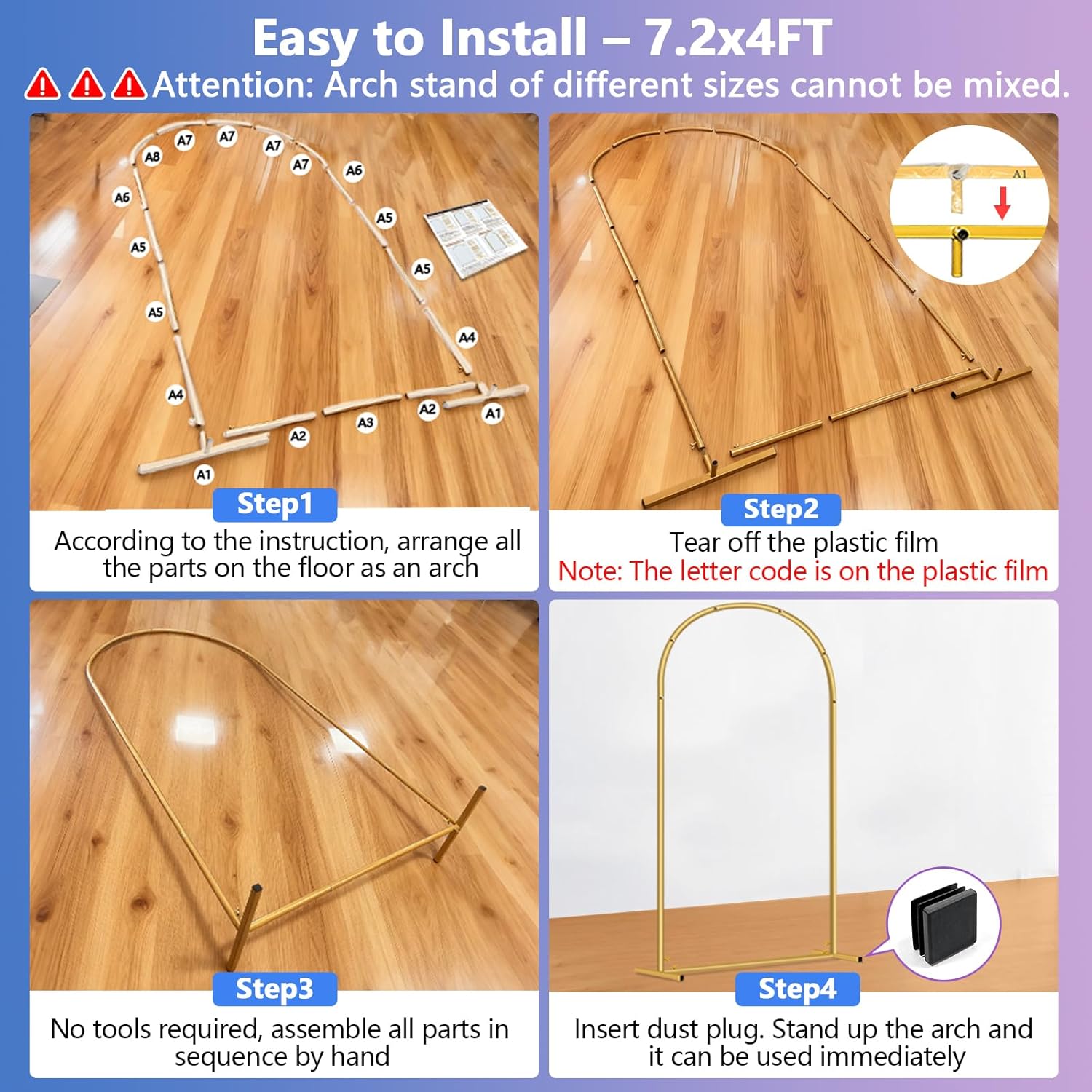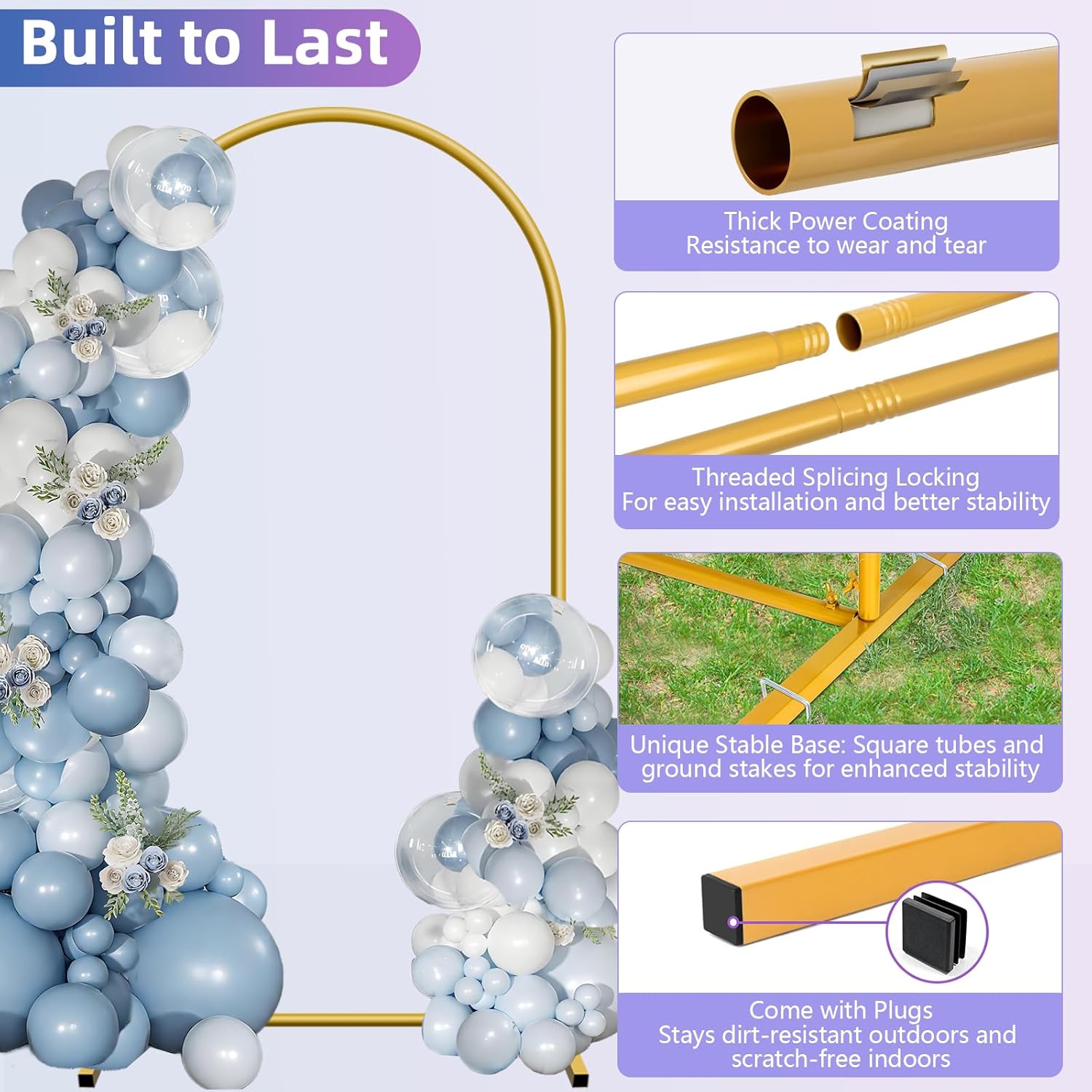 - Complete Ready to Use Kit: Includes all parts of arch backdrop stand set (size 7.2 ft/ 6.6 ft/ 6 ft), heavy-duty ground stakes (secures outdoor setups on grass or uneven terrain), 4 plastic dust-proof caps (blocks dirt/debris from tube ends), and an illustrated manual