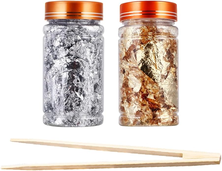 - with Wooden Tweezers: These gold flakes with tweezers come pre crushed into small, manageable pieces, our metallic foil flakes come with tweezers to help you easily pick up gold foil fragments, ensuring precise placement without any hassle; Each bottle contains 10g of flakes, with a total of 20g included in the package