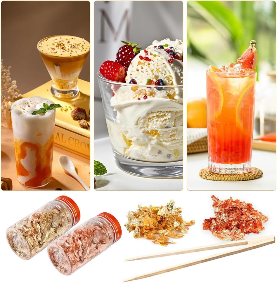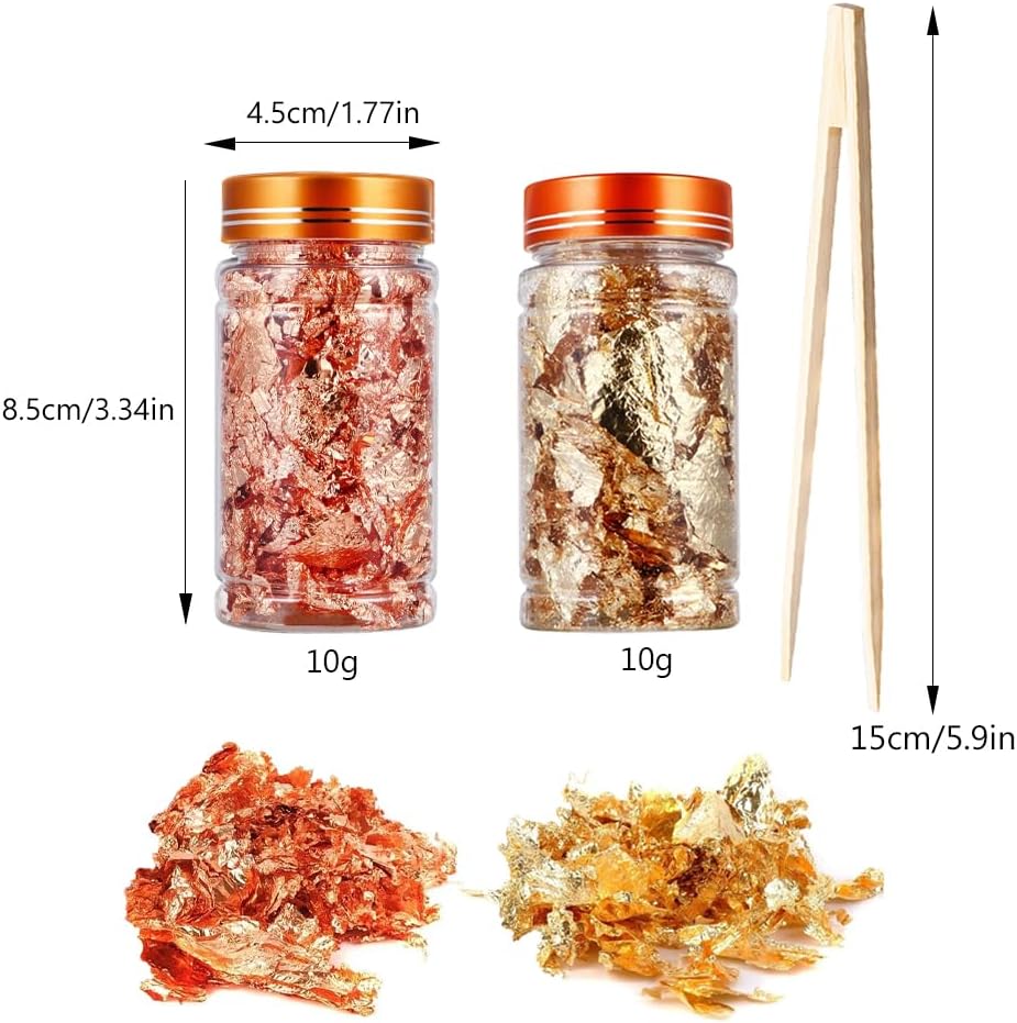 Gold Flakes for Resin, 2 Bottles 10g Imitation Golden Foil Gilding Flake Metallic Leaf for Cake Decoration Chocolate Making Nails Painting Art Crafts with Bamboo Tweezers (Gold, Copper Colors)