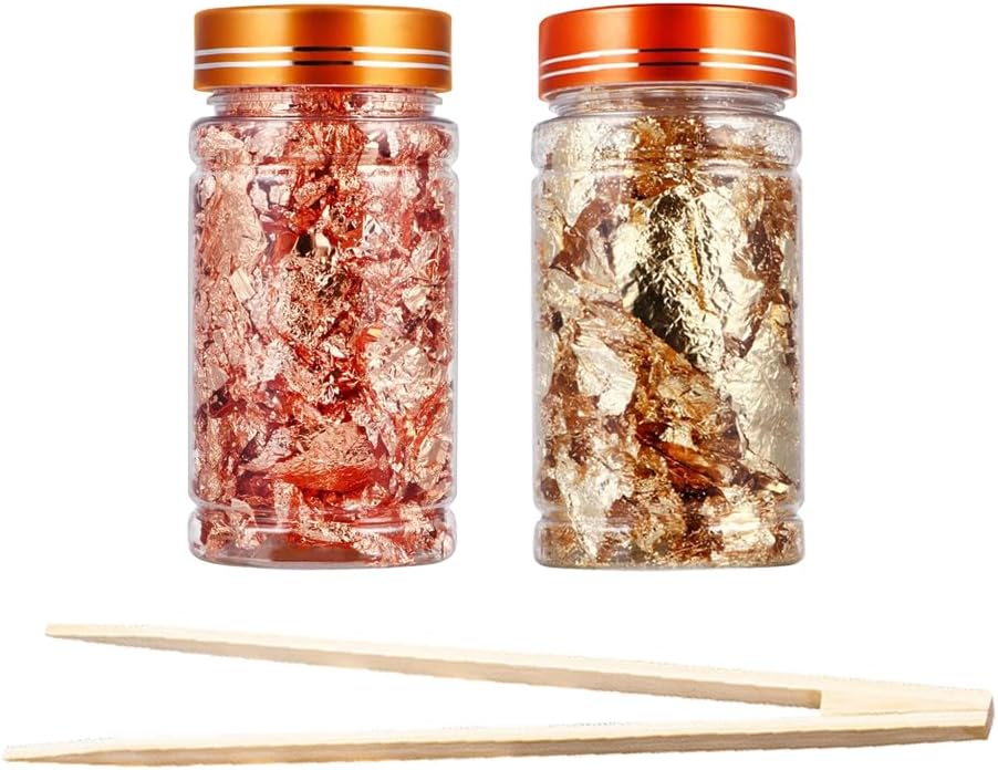 - with Wooden Tweezers: These gold flakes with tweezers come pre crushed into small, manageable pieces, our metallic foil flakes come with tweezers to help you easily pick up gold foil fragments, ensuring precise placement without any hassle; Each bottle contains 10g of flakes, with a total of 20g included in the package