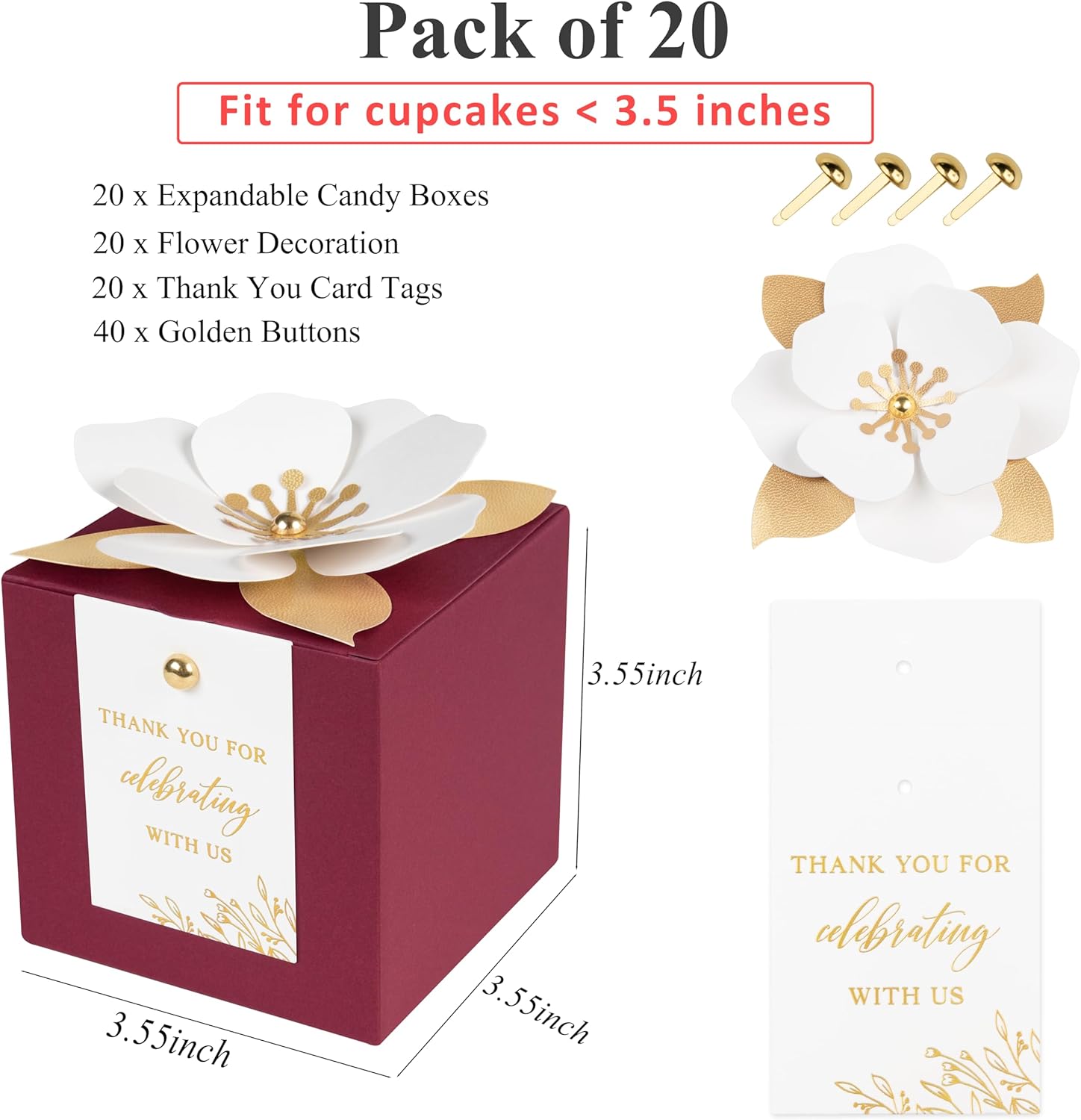 FEIYI 20 PCS Burgundy Gift Boxes, 3 In 1 Favor Boxes with Floral Decor, White Thank You Tags Cupcake Containers Gift wrapping for Wedding, Baby Shower, Birthday, Decorations Party - 3.55x3.55x3.55