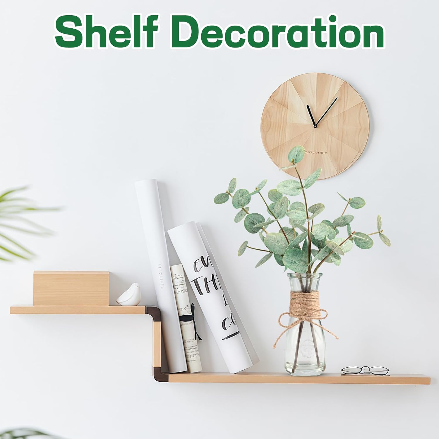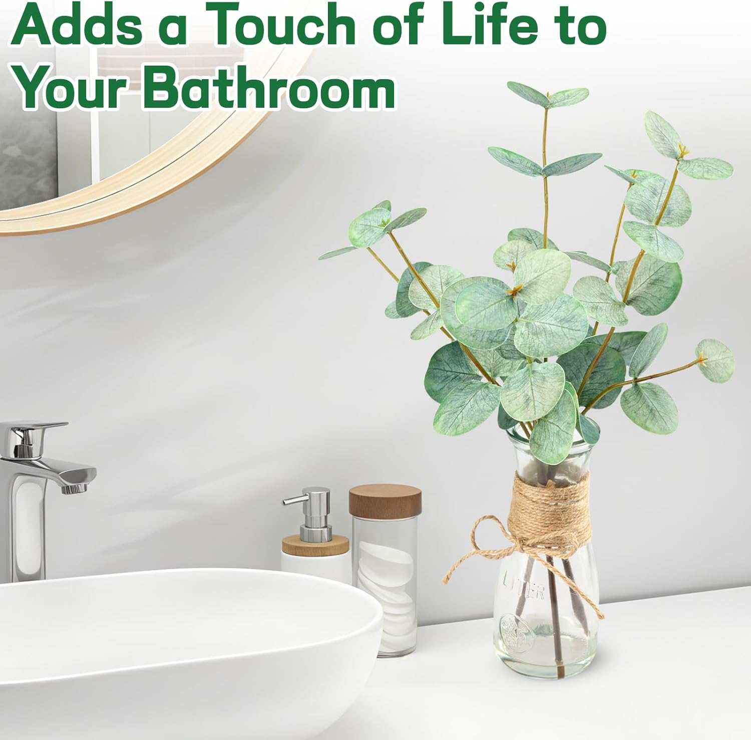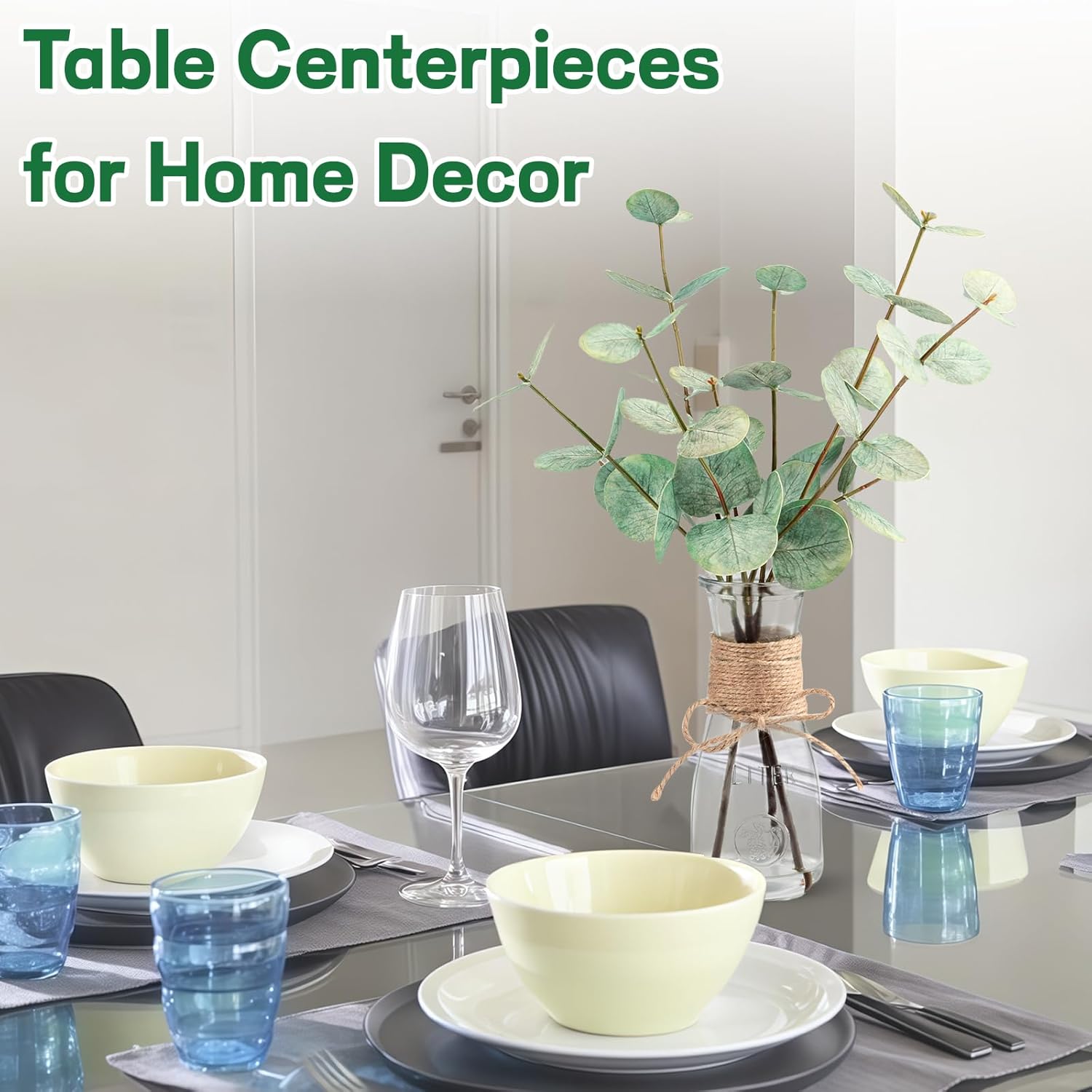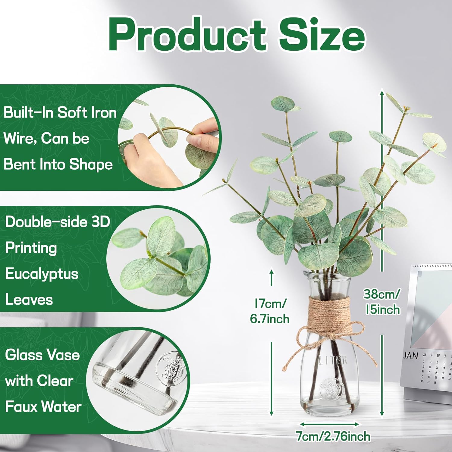 - 【Faux Plant Stems for Vase】: Each green eucalyptus leaf is handcrafted and comes with a clear glass vase (Total Height: 15")). The acrylic water ensures that the eucalyptus leaf adheres well to the glass vase, so you don't have to worry about it falling off or spend time arranging them.